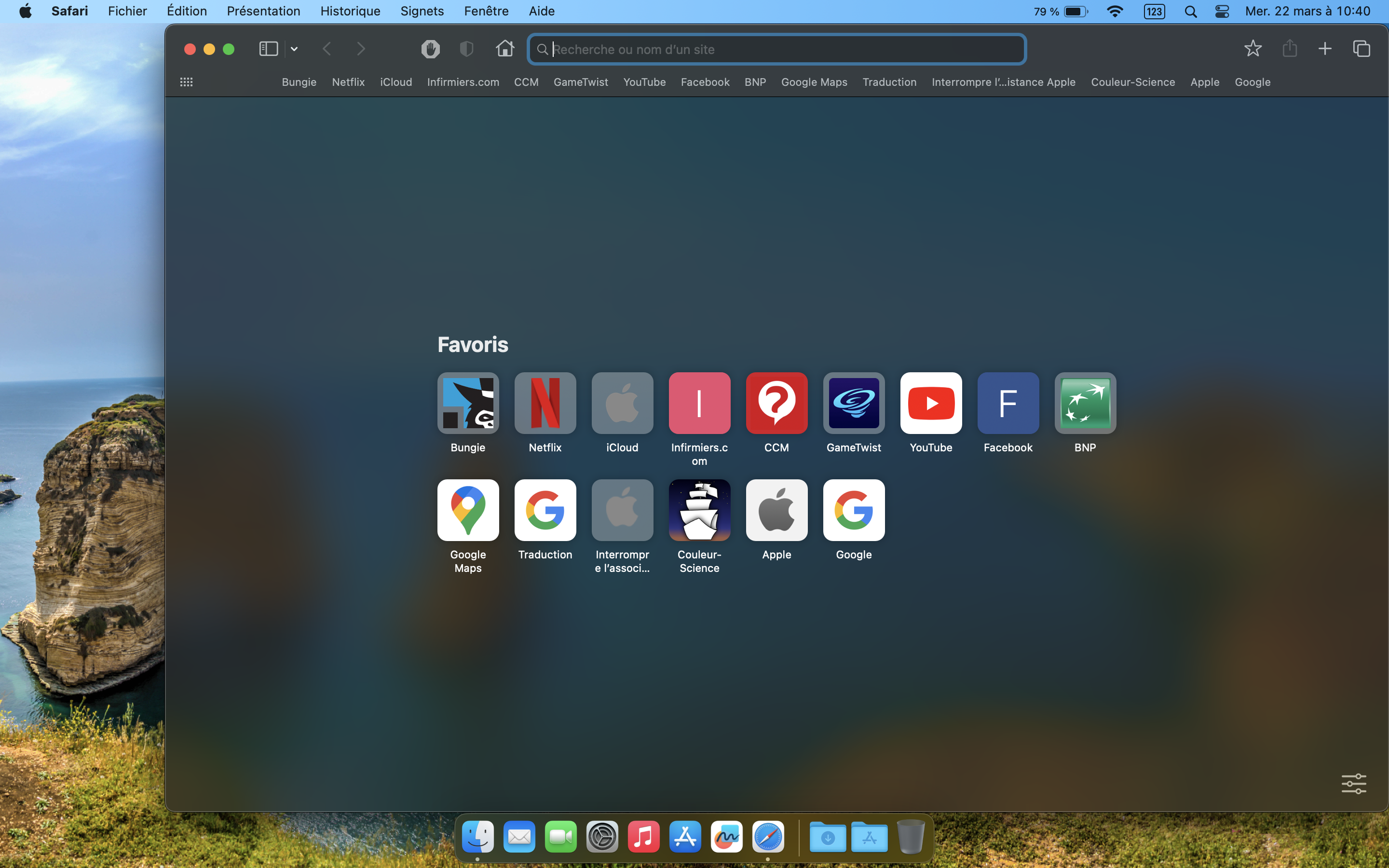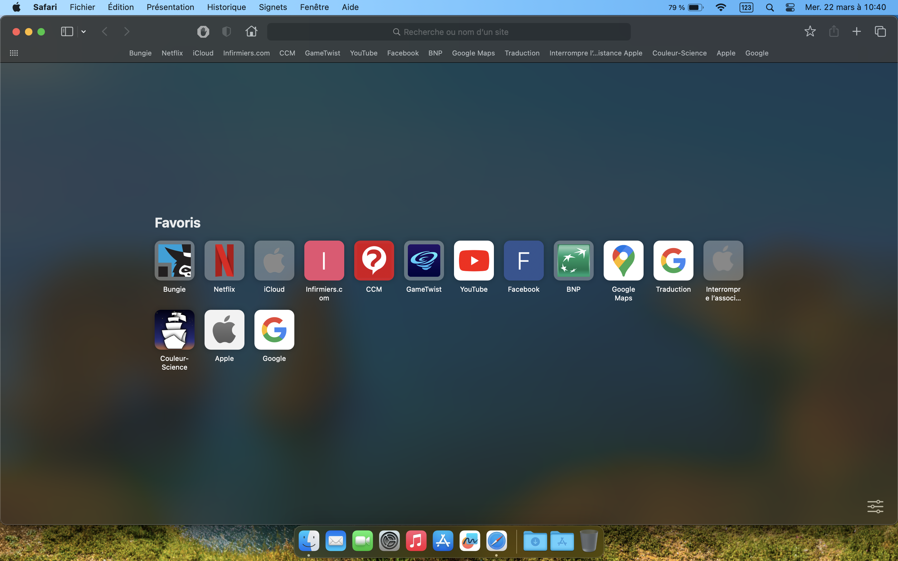 dans le coin supérieur gauche de la fenêtre de l’app Safari pour agrandir la fenêtre au maximum, puis que je ferme l'app Safari et l'ouvre à nouveau, l'app n'a pas gardé en mémoire le fait que j'avais agrandi la fenêtre avant de fermer l'app. La fenêtre qui s'ouvre ne prend donc pas tout l'écran.