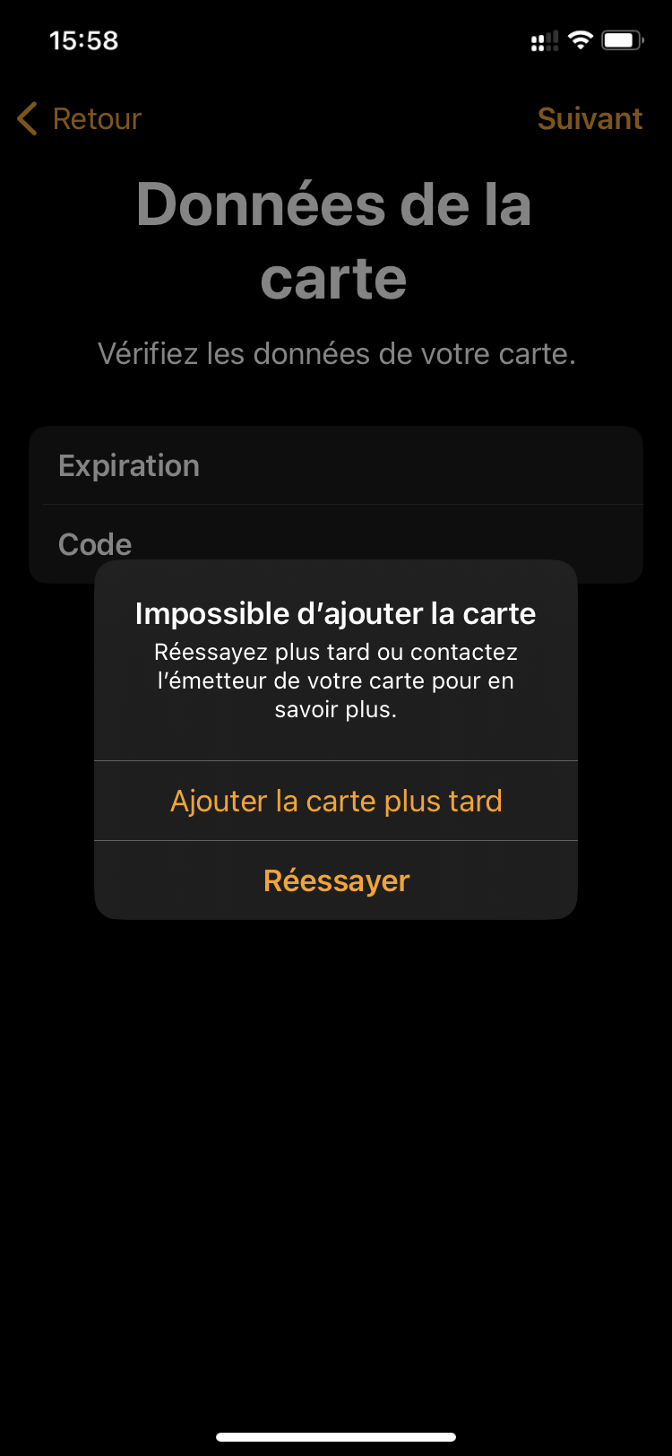 D'après la capture d'écran figurant dans ton post, j'ai l'impression que tu tentes d'ajouter ta carte bancaire directement dans l'app Cartes de ton iPhone. Il faudrait que tu vérifies s'il n'est pas possible d'ajouter ta carte à Apple Pay en passant directement par l'app de ta banque plutôt que par l'app Cartes.