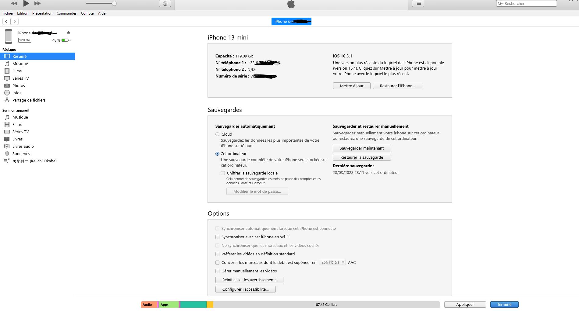 quand je clique sur l'icone de l'iphone voici les options que j'ai: