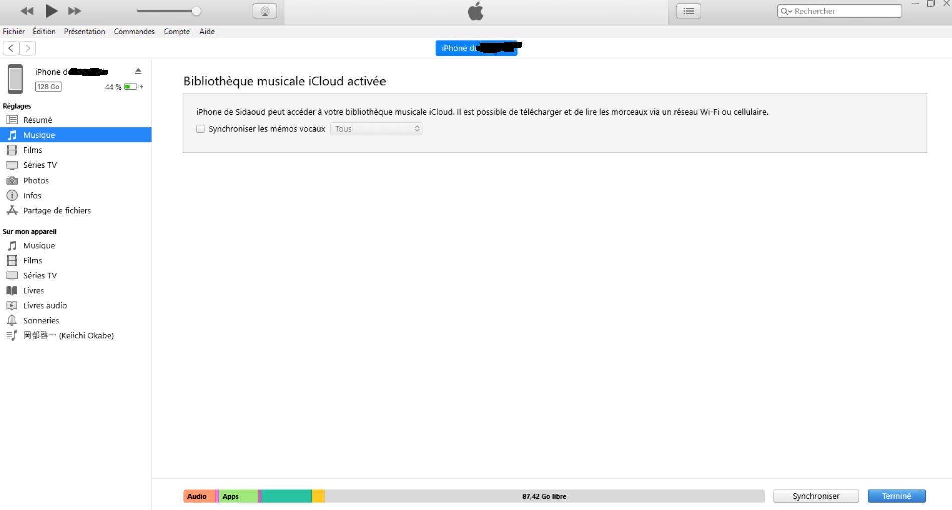 Et bien sur quand je clique sur synchroniser je n'ai pas le résultat que je souhaite, à savoir le transfère de mes musiques ajoutés dans la bibliothèque iTunes de mon pc. un charchement de quelques secondes qui fait je ne sait quoi et c'est tout.