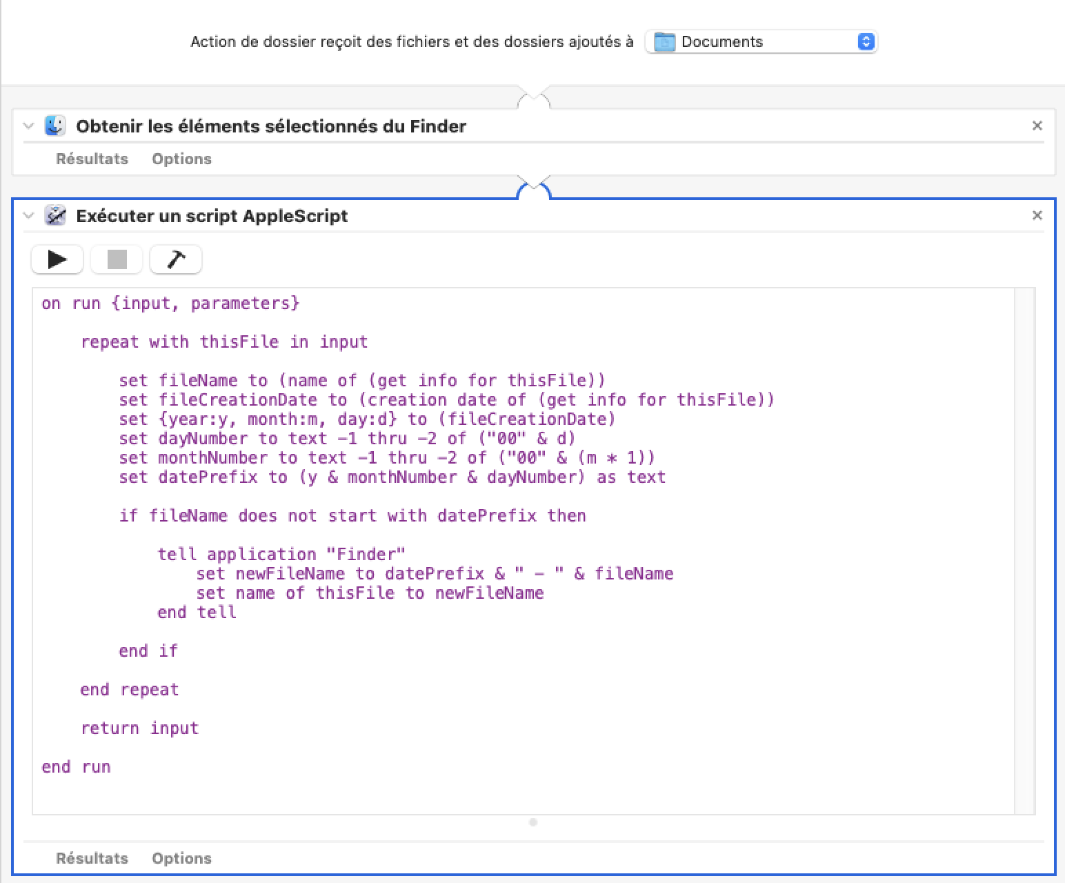Notez enfin que j'utilise le format "YYYYMMDD - nom du fichier originel", où YYYY est l'année, MM le mois et DD le jour (variable datePrefix dans le script) suivi d'un espace, d'un tiret, d'un autre espace et enfin le nom du fichier originel. Modifiez ce format à votre convenance.