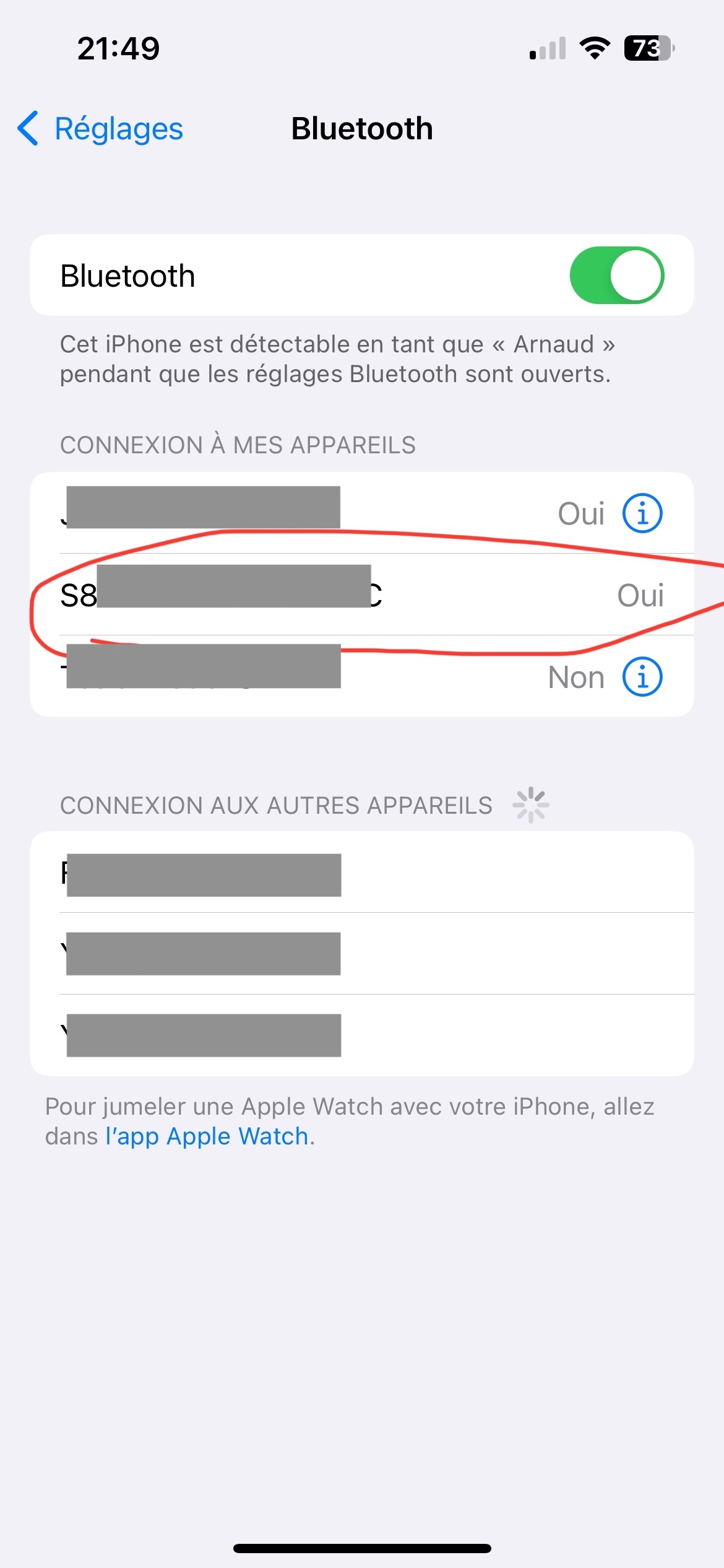 Si tu es à jour et que cet appareil est toujours dans tes réglages Bluetooth, je me dis qu'il peut venir d'un accessoire tiers comme une montre connectée ou même une voiture connectée par exemple. Est-ce que tu as un appareil de ce genre ? Si c'est le cas, tente de voir si tu peux déconnecter une app qui accompagnerait cet appareil pour voir si ça change quelque chose.