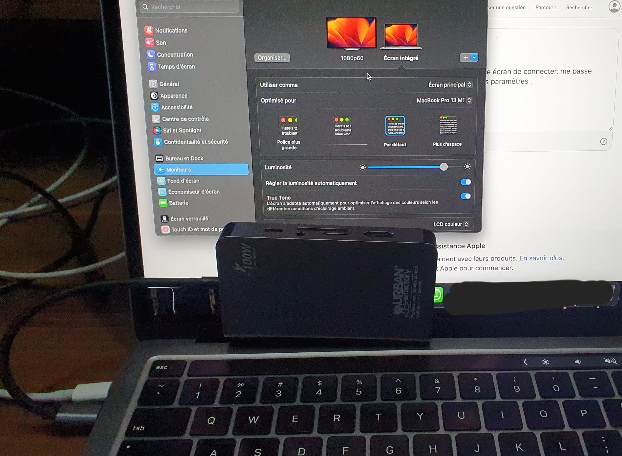 Depuis dès que je connecte le hub a mon Mac , le Mac considére que j'ai cette écran de connecter, me passe l'ordi en 1080p alors que le moniteur n'est plus connecter et apparait dans les paramètres .