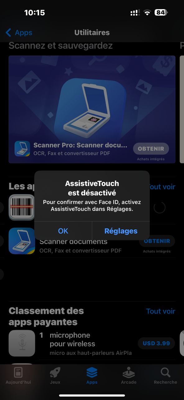 Le message suivant d'affiche <AssistiveTouch est désactivé pour confirmer avec Face ID, activez AssistiveTouch dans réglages.>.