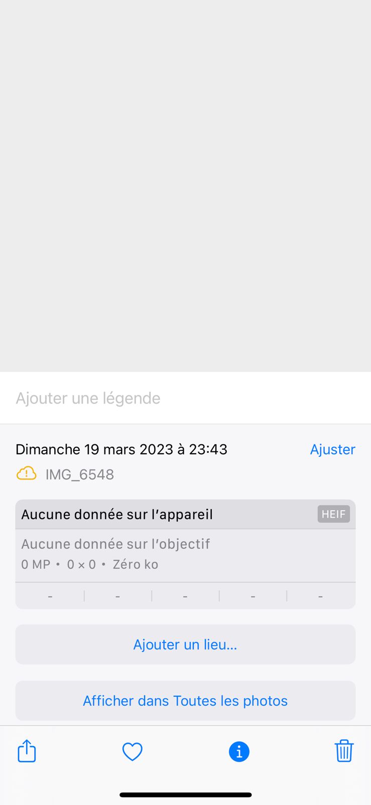 Je viens de vérifier mon iclould et il me semble que la photo ne s'est pas même télécharger sur le cloud, par contre je la vois toujours sur mon Iphone comme dans la première photo attaché et quand je clique sur modifier, il me donne le message affiché sur la 2 ème photo, et quand je clique sur le i, il me donne ce qui est affiché sur la 3 ème image, alors que je suis sur que quand j'ai pris la photo, j'ai vu que ça été enregistrée.