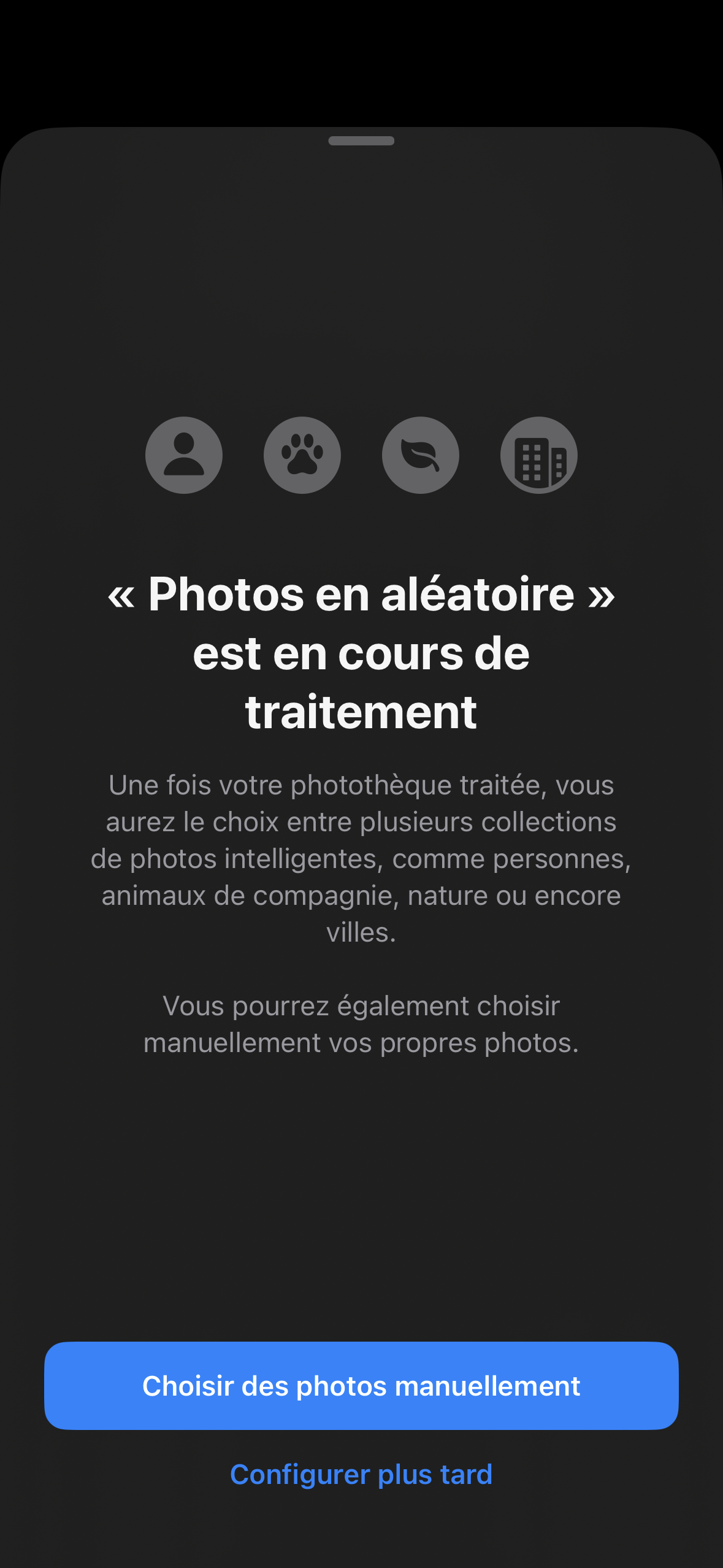 Si c'est le cas, il va falloir un peu de temps à ton iPhone pour analyser toutes tes photos afin de pouvoir te les proposer en mode aléatoire par la suite. Le temps nécessaire au traitement de ta photothèque va dépendre de sa taille et de ta connexion internet.