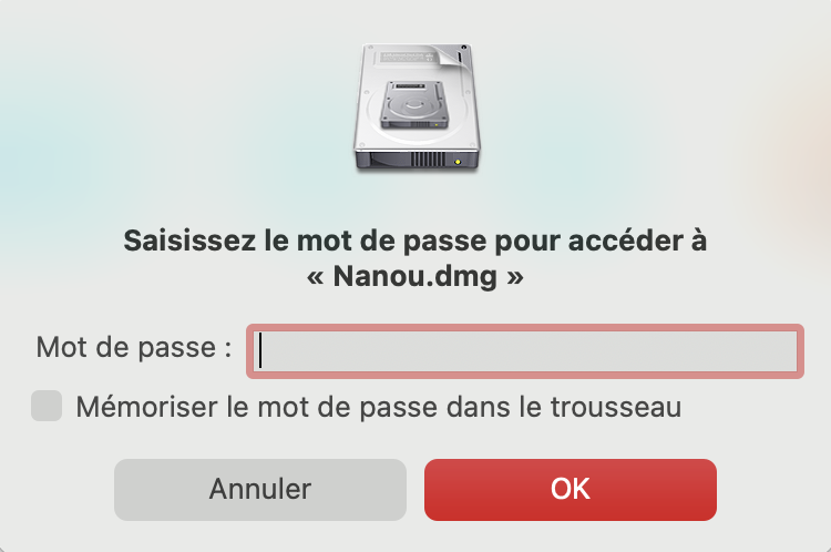 Mes mots de passe sont sauvegardés dans un dossier "Nanou.dmg" (image disque) créé avec "Utilitaire de disque". Ne pas cocher la case "Mémoriser le mot de passe dans le trousseau". 🤭