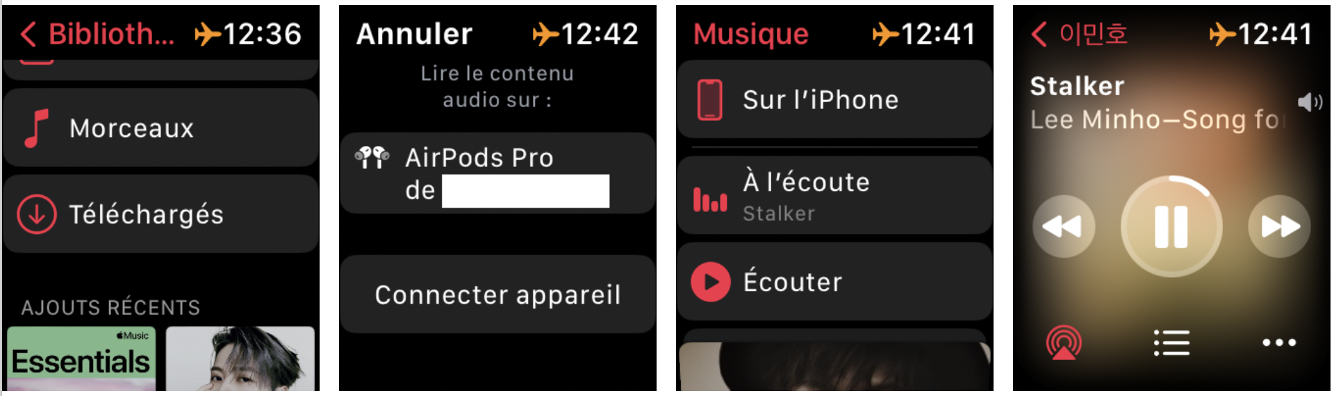 Je lance ma playlist sur la montre et elle me demande sur quel appareil la lire, je choisis mes AirPods.