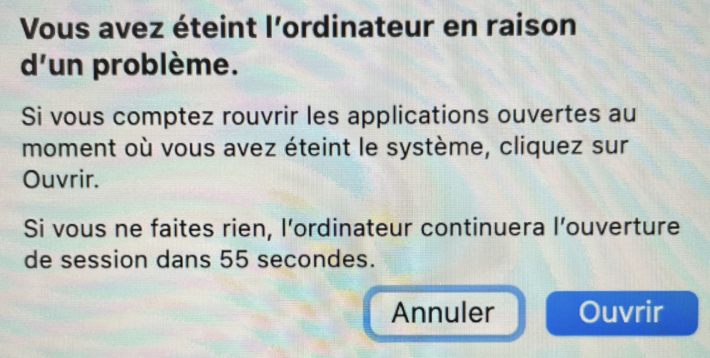 Lorsque j'allume mon Mac ou bien le redémarre (sans problème quelconque), un message s'affiche systématiquement depuis quelques semaines : "vous avez éteint l'ordinateur en raison d'un problème" juste après m'avoir demandé mon mot de passe alors que j'éteint mon ordinateur normalement sans forcer.