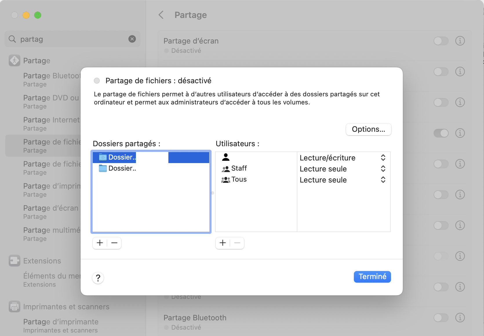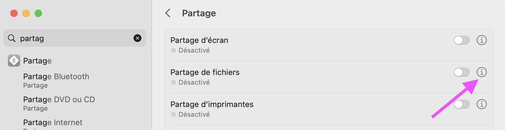 Cet autre article Utiliser le partage de fichiers sur Mac - Assistance Apple (FR) explique la marche à suivre lorsque le partage de fichiers est activé.