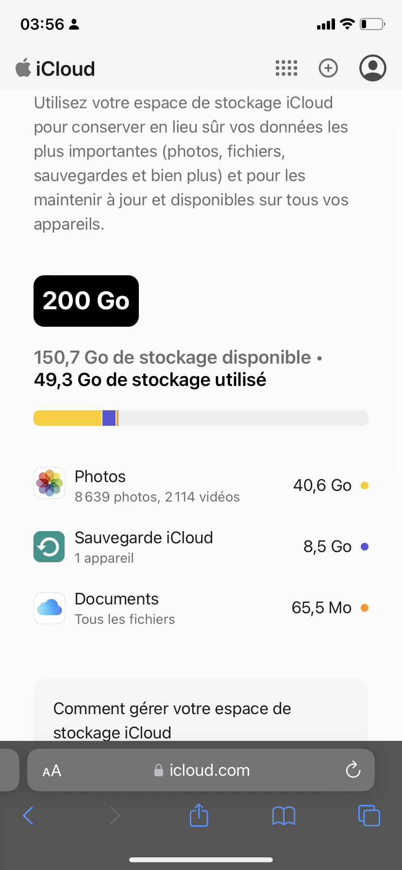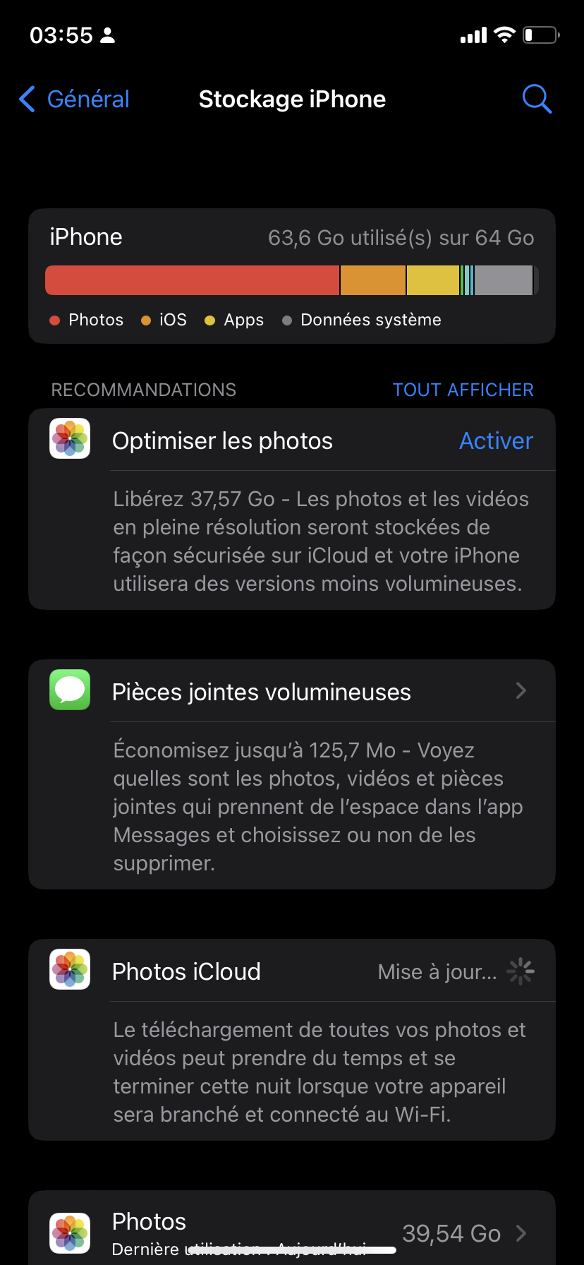 Bonsoir je rencontre un problème avec mon téléphone depuis 1 semaine , mon téléphone ne fais que de s’éteindre et il affiche un rond de téléchargement, puis mon téléphone m’a alerter que il n’y avais pas de stockage dans mon téléphone j’ai fais le liens , ça fais que j’ai payer du stockage sauf que dans mes réglages il affiche toujours 64go sauf que le payement est passer et je peux voir sur icloud que c’est marquer 200go