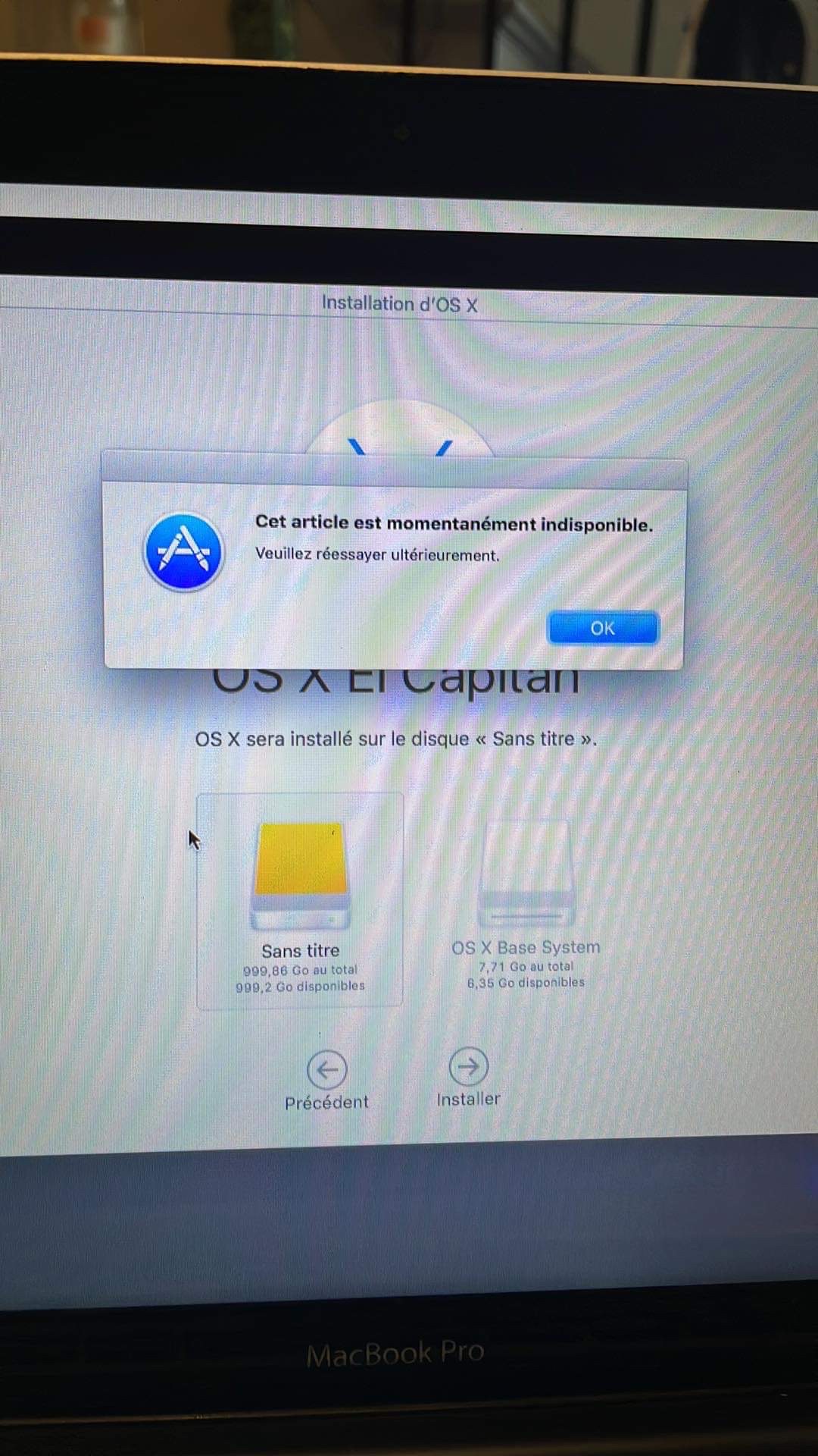 Bonjour, voilà j’ai un Mac Pro de mi 2009 13” j’ai changé mon disque dur par un Ssd, quand je lance l’installation de El Capitan il me demande d’insérer les ID Apple, et puis il me dit cet article est momentanément indisponible
