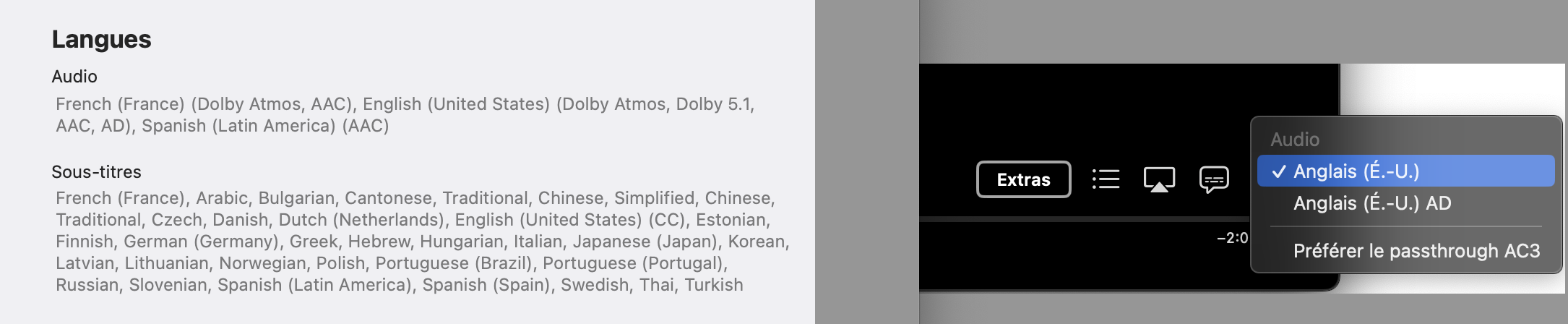 Je rencontre le même souci sur mon Mac où seul l'anglais m'est proposé, alors que sur l'iPhone et l'Apple TV, j'ai bien accès à l'audio Français.
