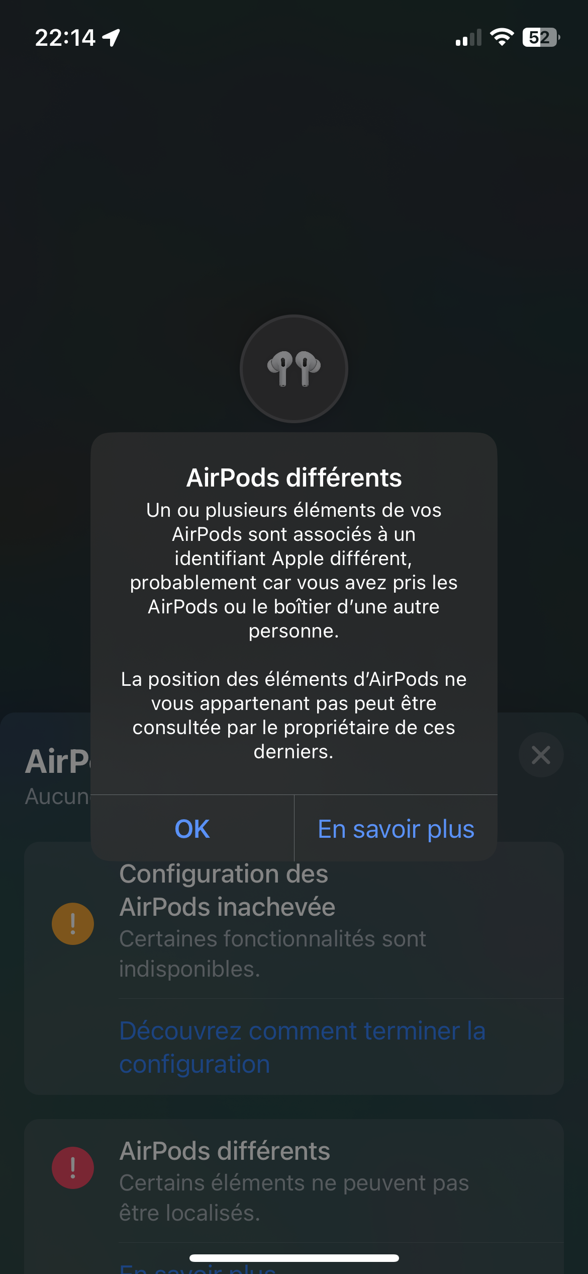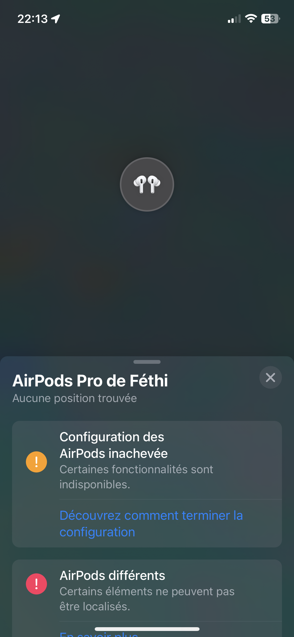 mes AirPods Pro s’affichent en configuration non achevée. Je peux donc pas les localiser. Je les ai réinitialisé plusieurs fois mais rien a faire.