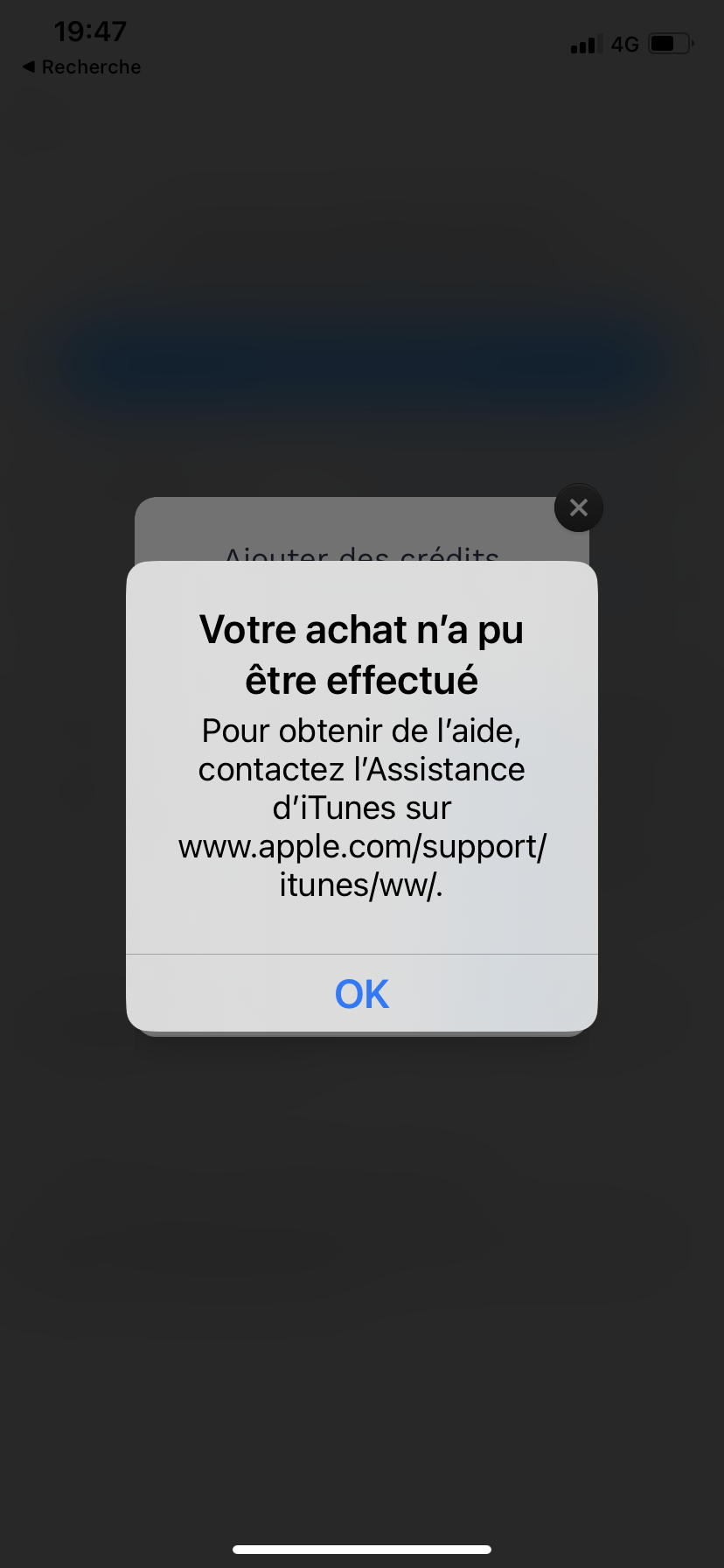 J’ai de l’argent sur mon compge itunes mais quand j’essaie d’effectuer un payement on me dis <<Votre achat n'a pu être effectué>>