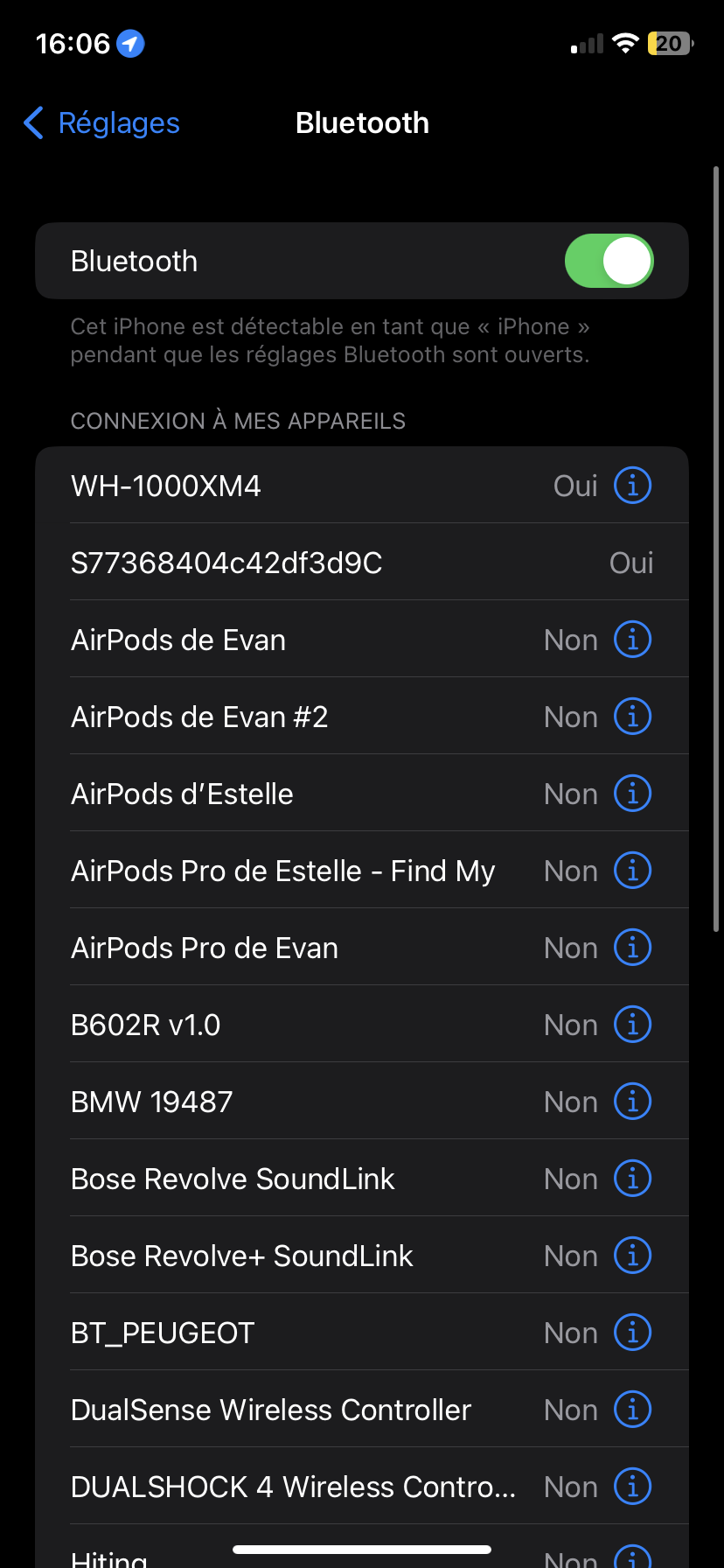 Il s'avère que Fitbits, Tesla et d'autres applications de constructeurs automobiles peuvent configurer le contrôle des connexions bluetooth, ce qui supprime l'option "i". La solution pour déterminer quelle application créait l'appareil était d'aller à :