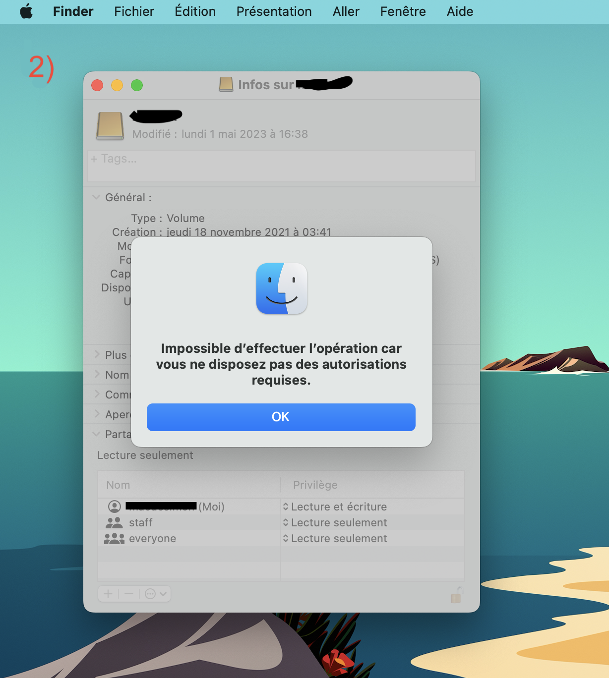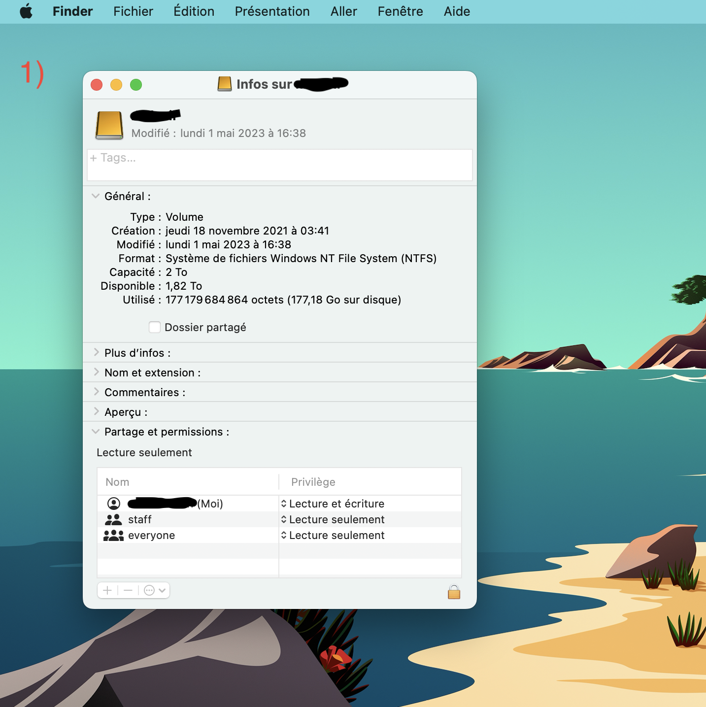 Bonjour, j'ai récemment fait l'acquisition d'un Macbook Air M1, tournant sur macOS Ventura 13.3.1, et mon problème est que je souhaite tout simplement déplacer des fichiers (de "Téléchargements" par ex.) vers mon disque dur externe (que j'utilise depuis quelques temps et qui comporte des fichiers et documents), mais je n'y arrive pas, pour des problèmes d'autorisations je suppose. J'ai donc cliqué sur le nom de mon support > "Fichier" > "Lire les informations" > Rubrique "Partage & permissions" pour tenter de résoudre cela. Il est écrit "Lecture seulement", ce que je souhaite changer, ensuite, je vois l'affichage des noms d'utilisateurs avec la possibilité de modifier le type d'autorisation (soit "Lecture seulement" ; soit "Écriture seulement" ; soit "Lecture et écriture" (celle qui est déjà activée ) ; ou encore "Accès interdit"). -Image 1)-