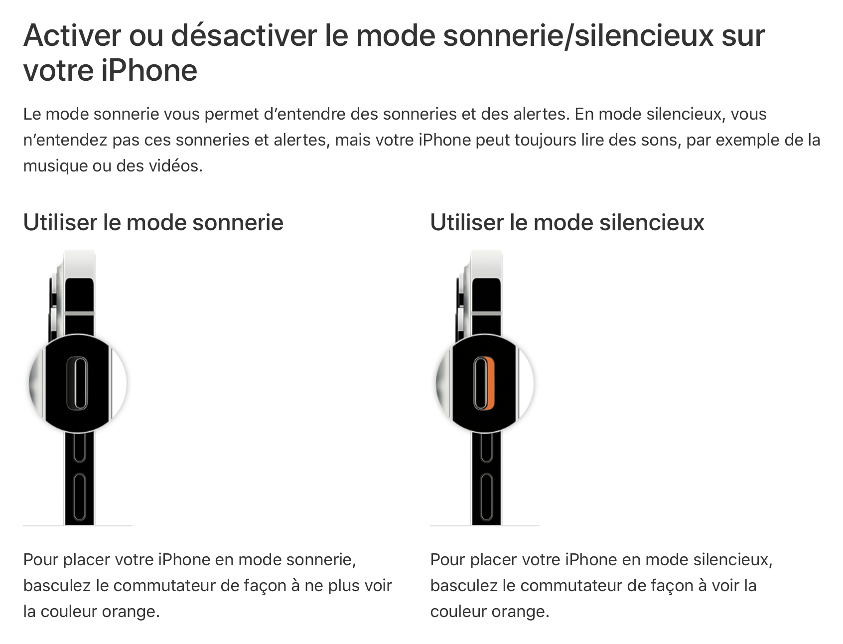 (Source : Activer ou désactiver le mode sonnerie, le mode silencieux ou le vibreur sur votre iPhone - Assistance Apple (FR))