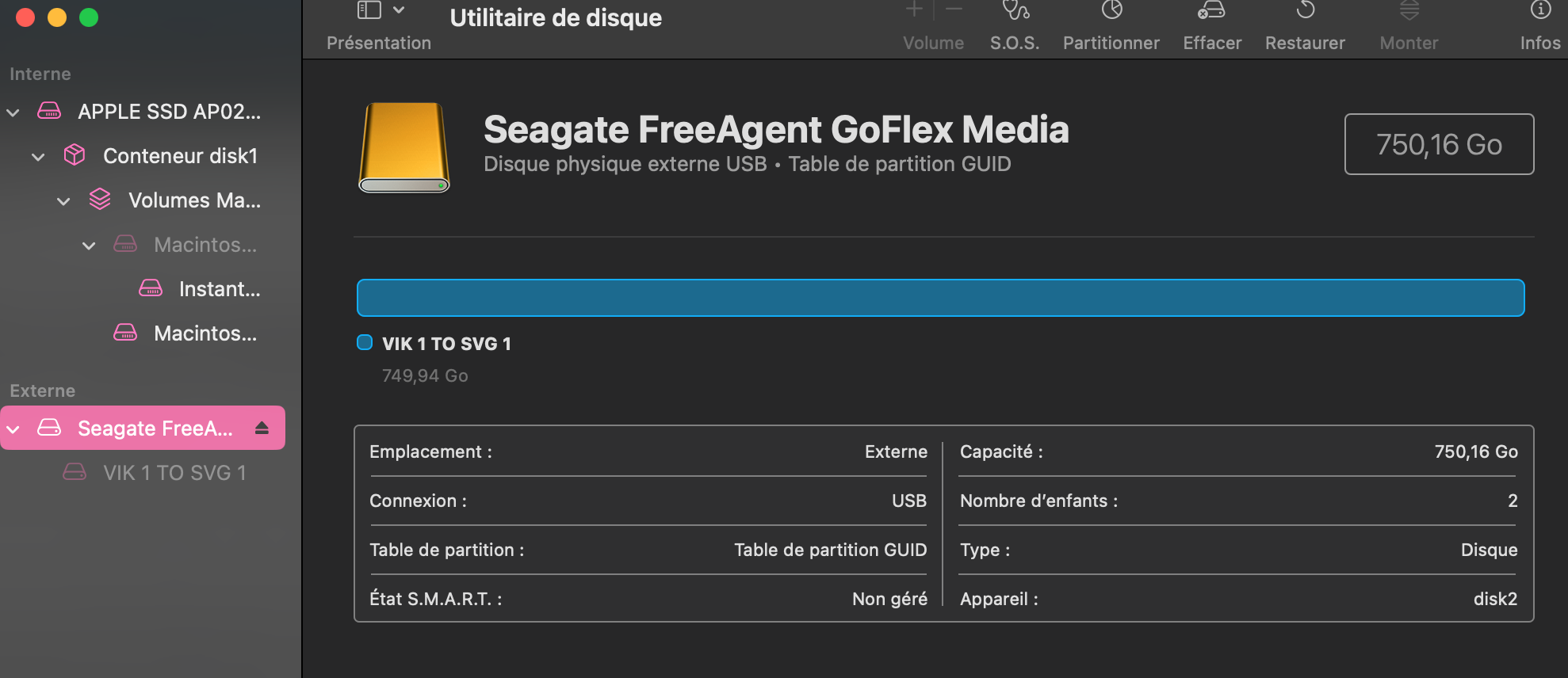 SEAGATE dit: """Pour résoudre ce problème, vous devez effacer le disque, puis sélectionner le schéma Table de partition GUID. Si vous utilisez le disque uniquement sur Mac, sélectionnez un format spécifique de macOS. Par exemple, Mac OS étendu (journalisé) ou APFS. Si vous devez l’utiliser à la fois sur Mac et sur Windows, sélectionnez ExFAT.