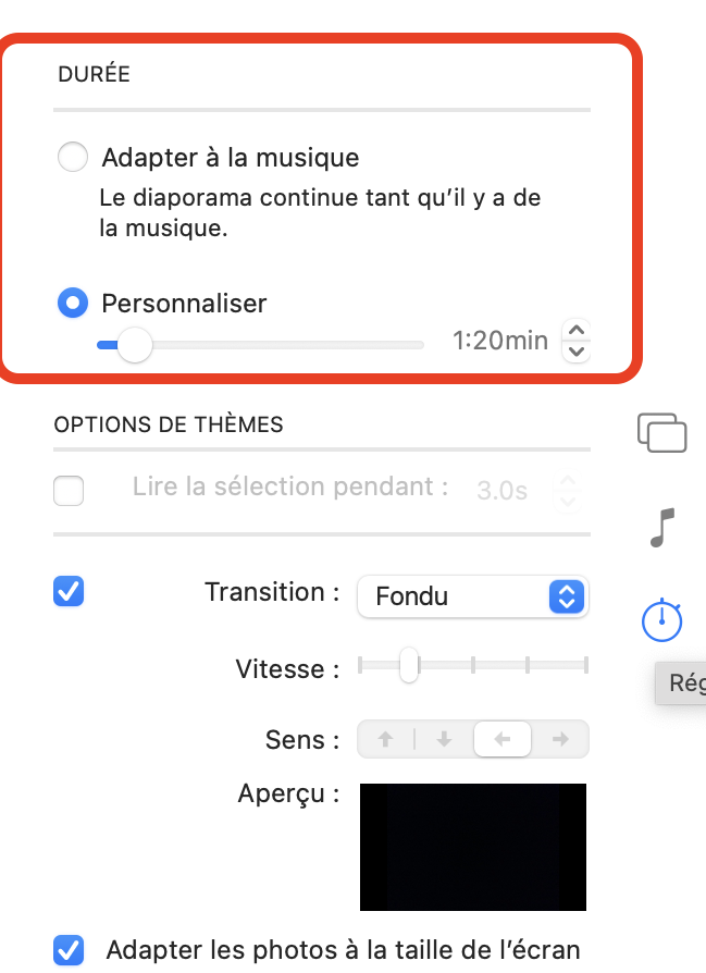 J'ai regardé sur mon Mac pour faire un test (je ne te cache pas, que je ne me sers jamais de la fonctionnalité diaporama 😅).