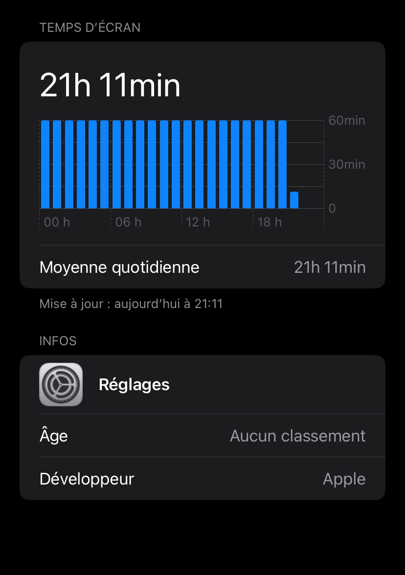 Bonjour, depuis 3 semaines mon temps d’écran m’affiche une moyenne hebdomadaire de 24h avec chaque jour 24h d’utilisation qui sont pour les trois quarts utilisés par l’application réglage. Je ne comprends pas ce phénomène car je ne vais sur les réglages que très peu par jour et ferme toujours la fenêtre et je n’utilise certainement pas mon téléphone 24h par jour. Quelqu’un aurait une solution pour y remédier ?