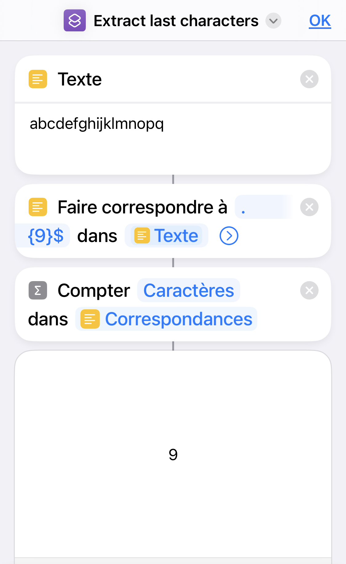 Je cherche à déterminer le nombre de caractère d'un texte avec raccourci pour iPhone. Le chemin que j'ai exploré est avec la fonction "faire correspondre à". Je n'arrive pas à construire le code en regex qui fonctionne à mettre dans la fonction.