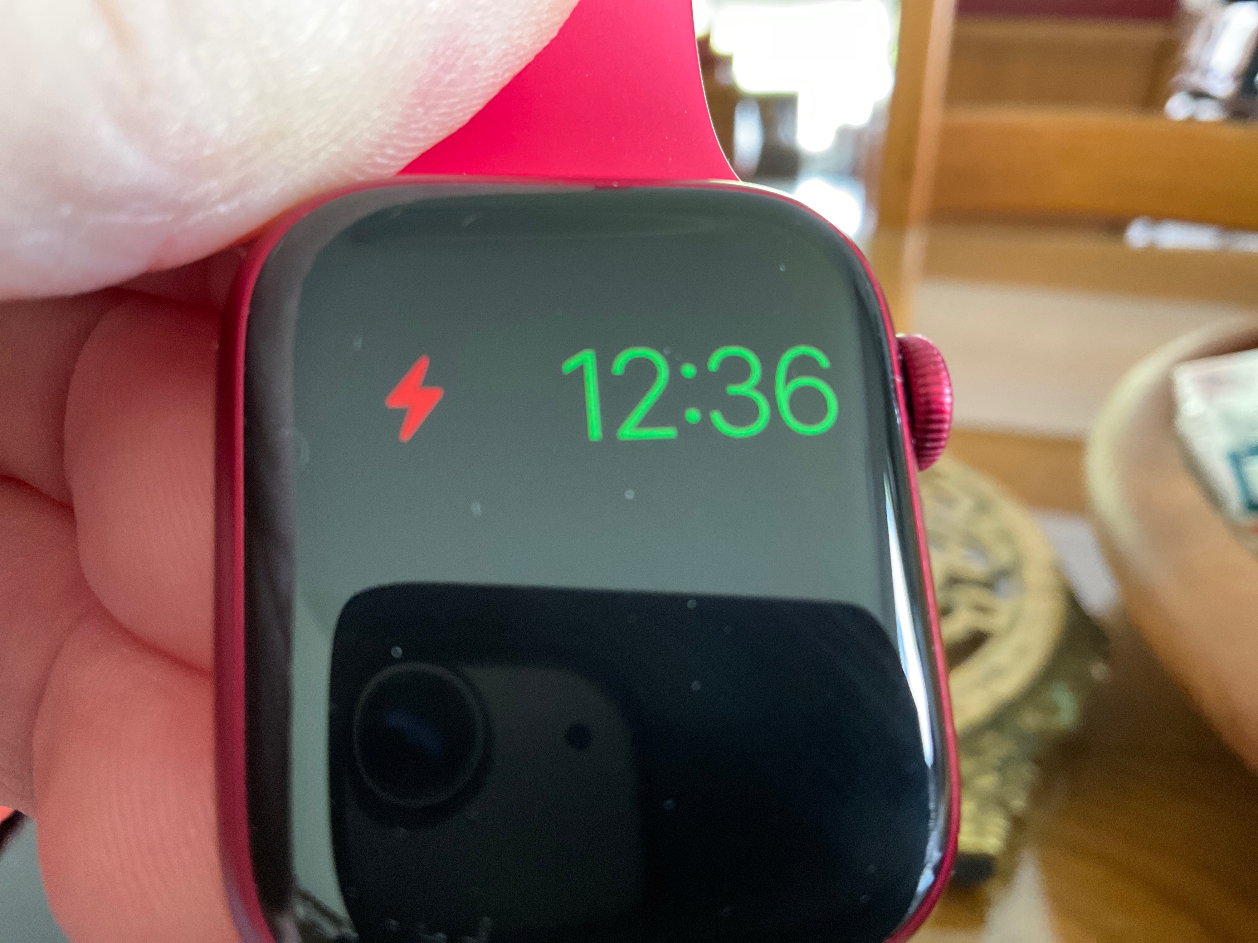 a notre retour impossible de rallumer l apple watch et et l iphone ne la reconnecte pas . Lorsque nous appuyons sur la montre , juste l heure et un eclair rouge apparait …. QUE FAIRE ? Merci
