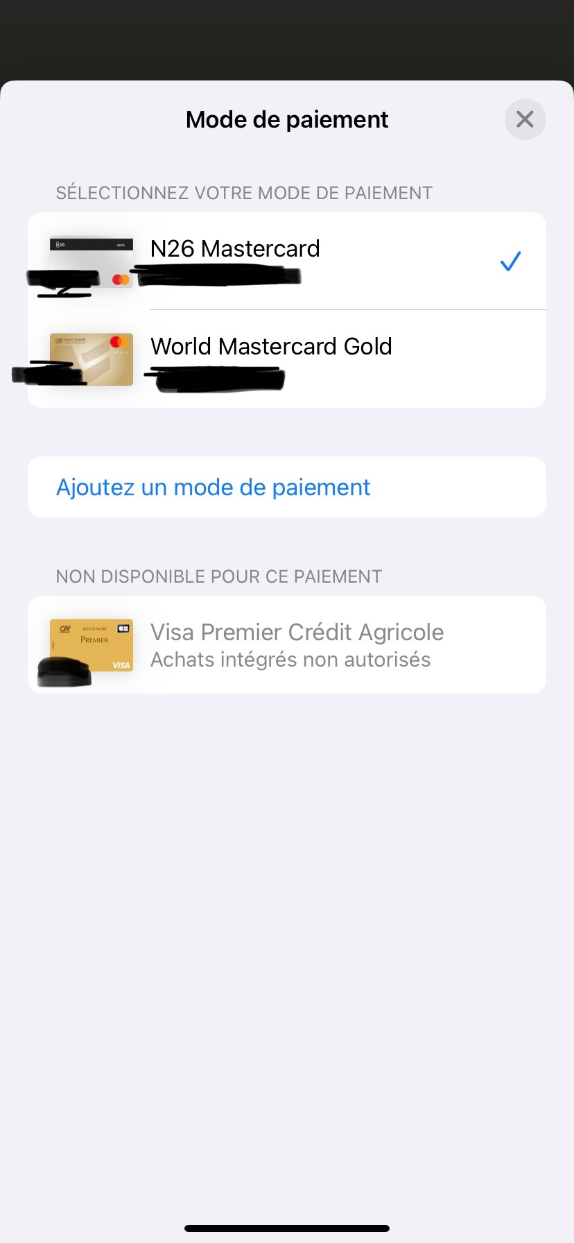 J’ai été dans Réglages>ID Apple>Paiement et livraison et j’ai supprimé l’ancienne carte qui se trouvait toujours là.