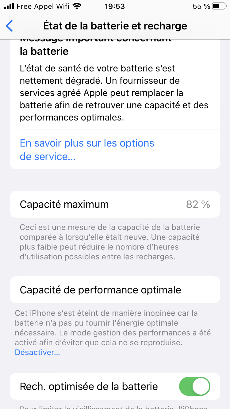 As-tu tenté de désactiver l'option Recharge optimisée de la batterie ? Cela change-t-il quelque chose ?