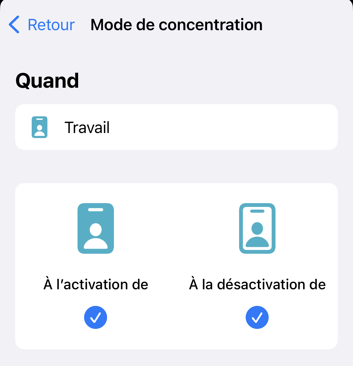 - Faites défiler la liste vers le bas et sélectionnez “Travail” dans la section “MODE DE CONCENTRATION”.