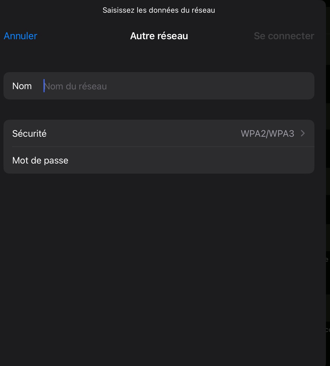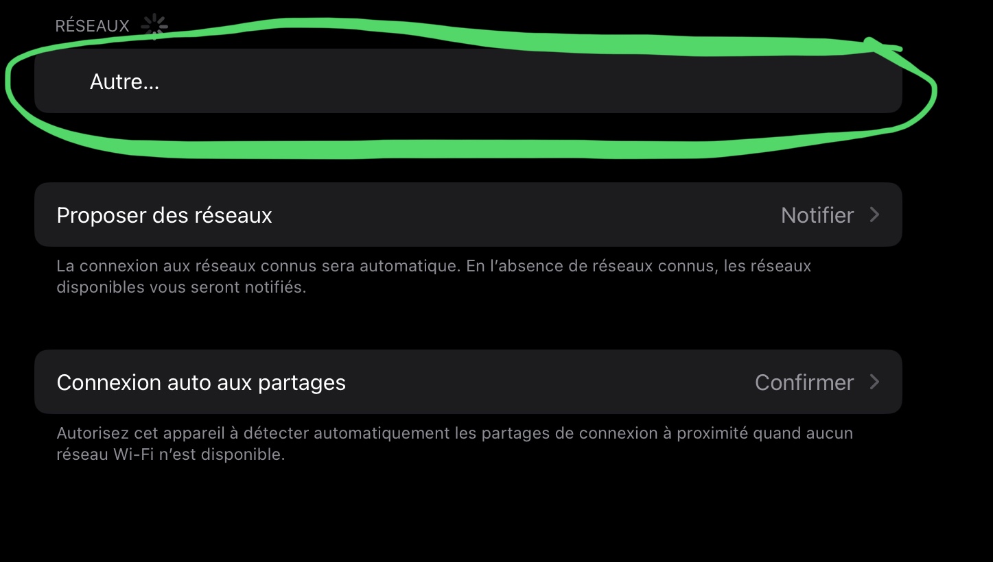 Pour ce problème, essayez d’aller dans réglages > Wi-Fi > Autre… et de saisir le mot de passe et le nom du réseau. ( Regarder le screenshot pour comprendre ).