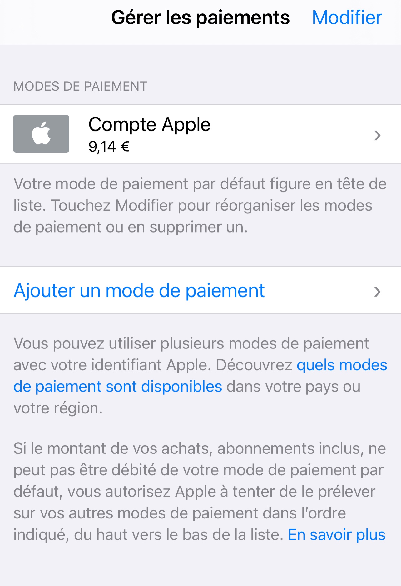 Sache que si tu as plusieurs modes de paiements liés à ton identifiant Apple, le solde de ton identifiant Apple sera utilisé comme mode de paiement par défaut, à condition qu'il soit suffisant pour couvrir le montant intégral de ton achat. Le solde de ton identifiant Apple sera donc utilisé automatiquement sans que tu n'aies besoin de faire quoique ce soit.