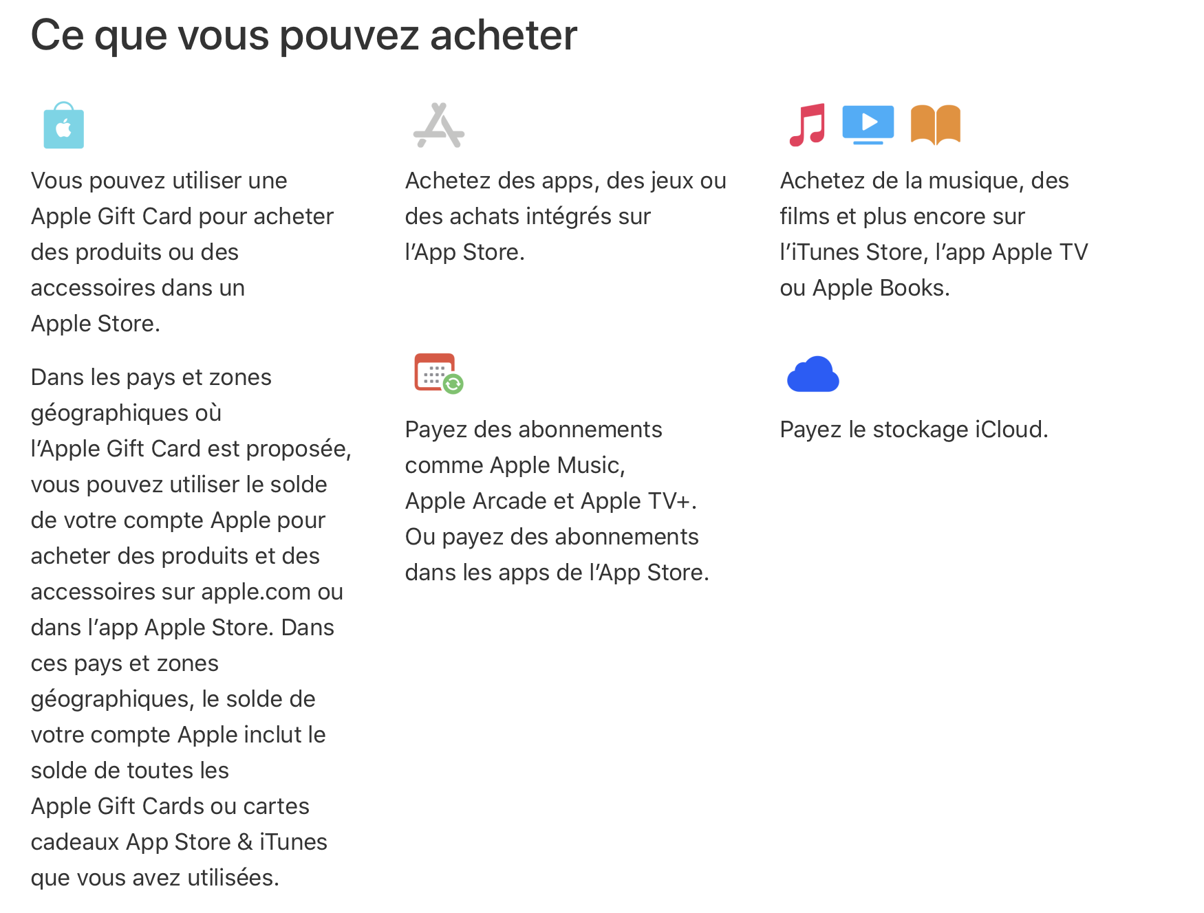L'article Contenu pouvant être acheté avec votre Apple Gift Card ou le solde de votre compte Apple - Assistance Apple (FR) partagé par @DobbyIsAFreeHelp explique ceci :