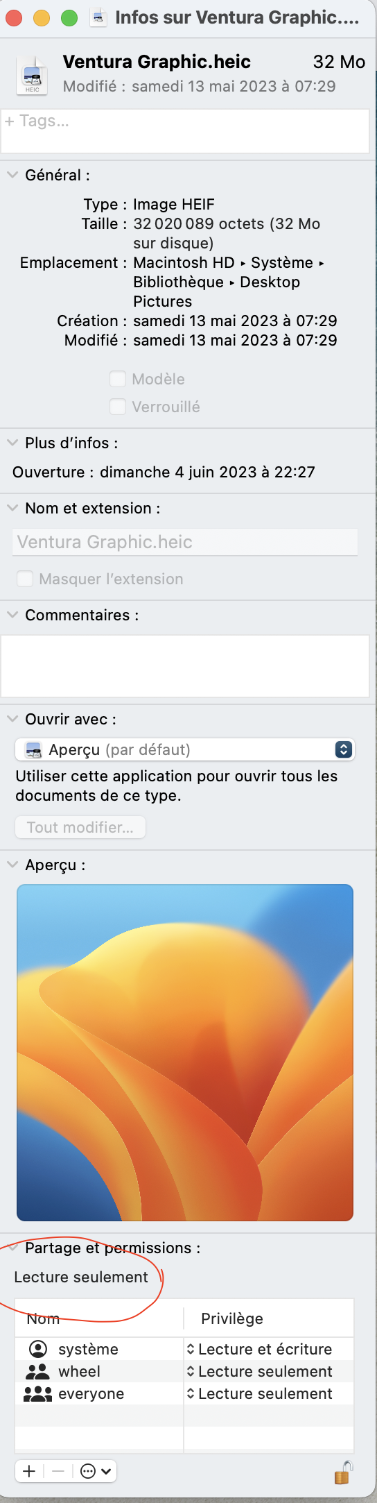 J'ai vu que dans Système/ Bibliothèque/ Desktop Pictures figure un dossier Ventura Graphic.heic que je voudrais changer si j'y avais accès. Ce qui n'est pas le cas.