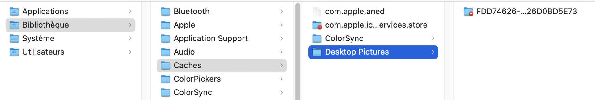 Je suis allé dans Finder puis onglet Aller puis dossier Ordinateur puis Macintosh HD/ Bibliothèque / caches et il n'y a aucun dossier Desktop Pictures ni avec un nom hexadécimal. Par contre. il y a un dossier Desktop Pictures directement rattaché à Bibliothèque. Dans ce dossier, il n y a pas non plus de dossier portant un nom hexadécimal.