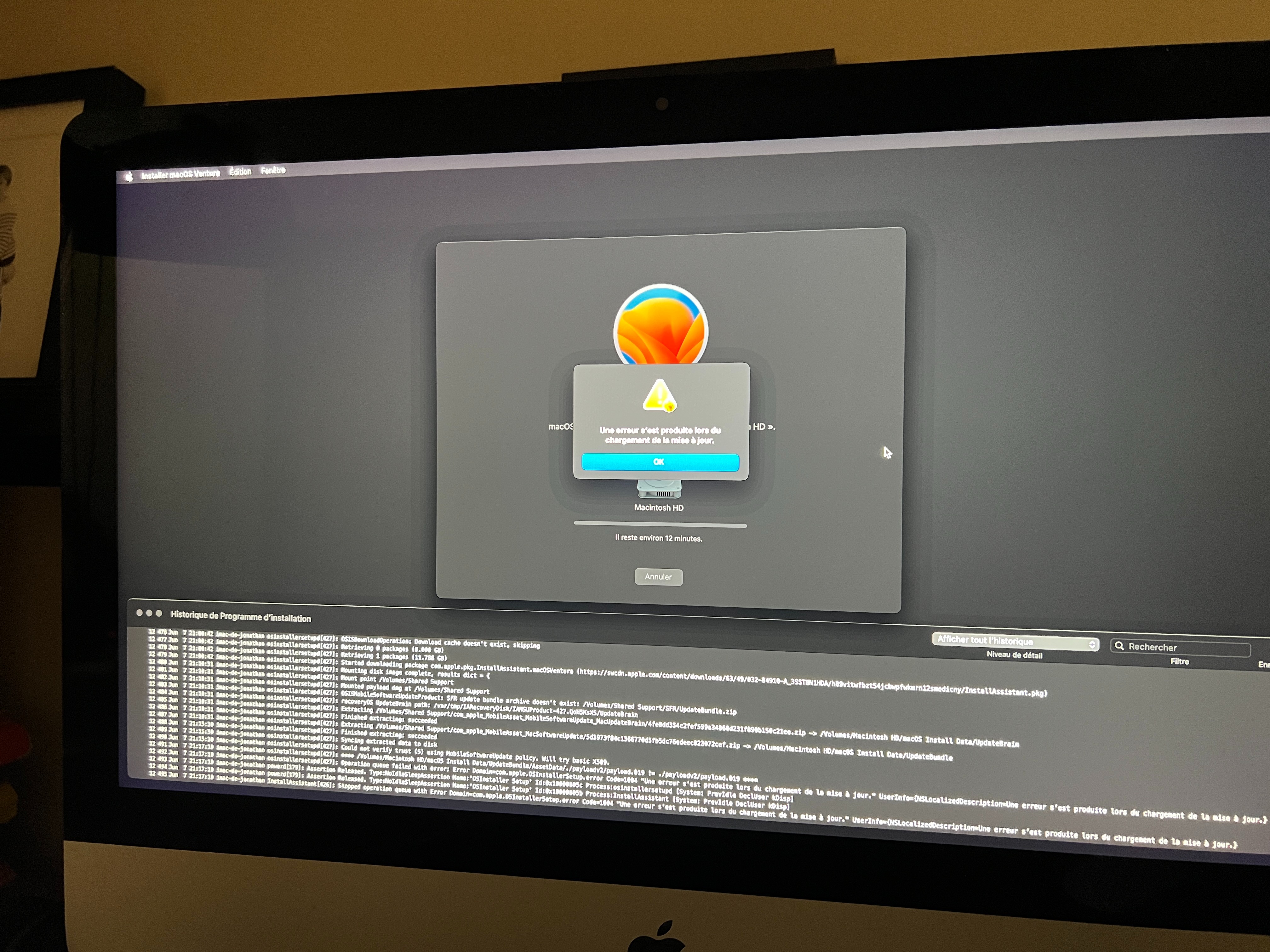 J'ai essayé d'installer MacOS Ventura/Monterey et même Sierra sur un iMac 2017 21.5. Mais j'ai une erreur à chaque fois.