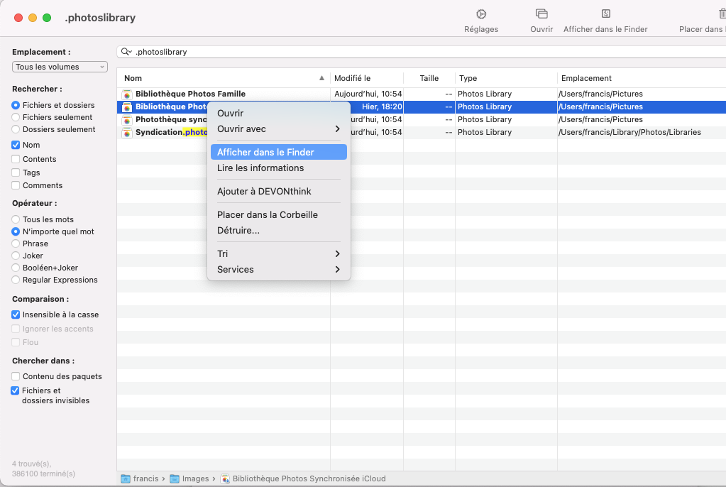 Toutes les photothèques créées par Photos, quels que soient leurs noms, ont comme suffixe .photoslibrary, je suggère donc de faire une recherche sur l'ensemble de votre Mac sur ce terme .photoslibrary ; et cela avec un utilitaire comme EasyFind. EasyFind peut être paramétré pour rechercher tout type de fichiers et partout sur le Mac.