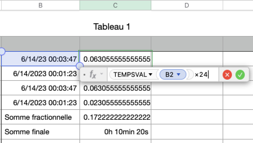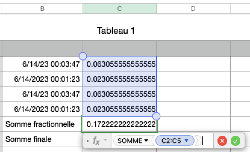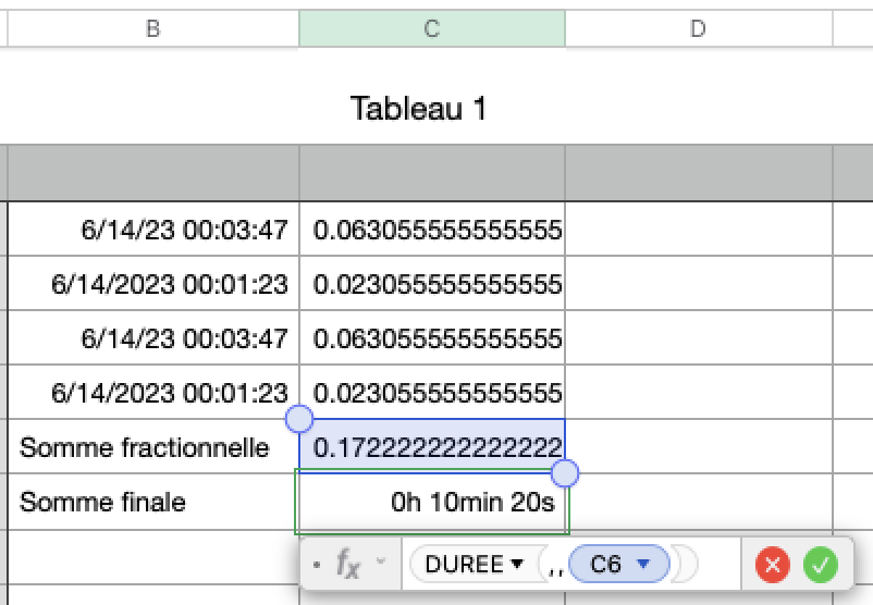 J'ai commencé à rentrer des durées dans Numbers et le logiciel est parti du principe qu'il s'agissait de l'heure d'une date. Il a ajouté la date d'aujourd'hui à chaque fois mais en le cachant et c'est seulement au bout de 500 lignes que je m'en suis rendu compte. Je ne peux donc pas additionner ces durées comme, selon le logiciel, ce n'en sont pas. Y a-t-il un moyen de convertir rapidement cette colonne de date en durée, en retirant au préalable la date invisible, afin de pouvoir ensuite faire mon addition ? Comme la date n'apparait pas, mais est quand même techniquement là, je ne peux même pas la convertir via l'onglet de droite elle revient en mode auto. L'idée de retaper les 500 lignes à la main ne me réjouis pas beaucoup.. haha