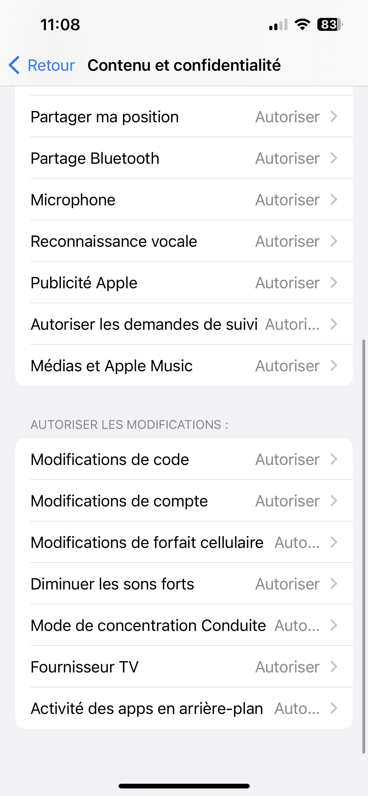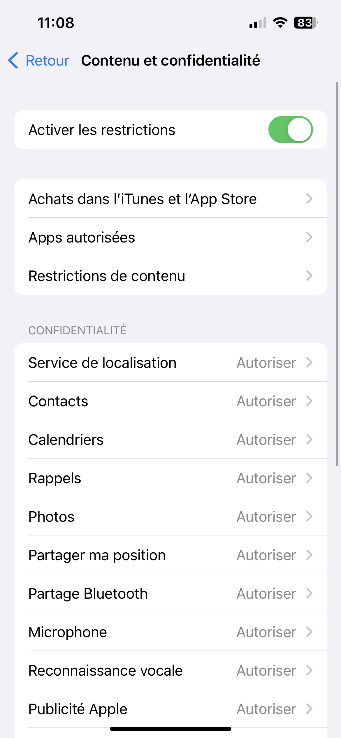 Autrement, est-ce qu'il y a des restrictions d'activées actuellement ? Tu peux vérifier ça dans Réglages > Temps d'écran > Contenu et confidentialité.