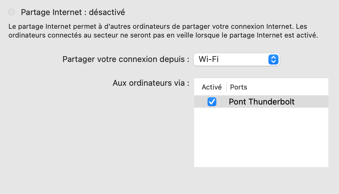 Sur préférences système > partage > partage internet, en voulant partager ma connexion wifi depuis mon macbook pro vers un autre pc via wifi, la seule option disponible est 'Pont thunderbolt'.
