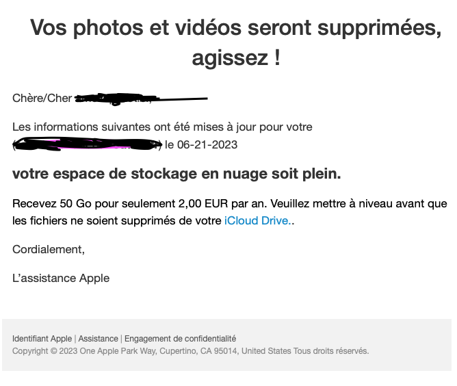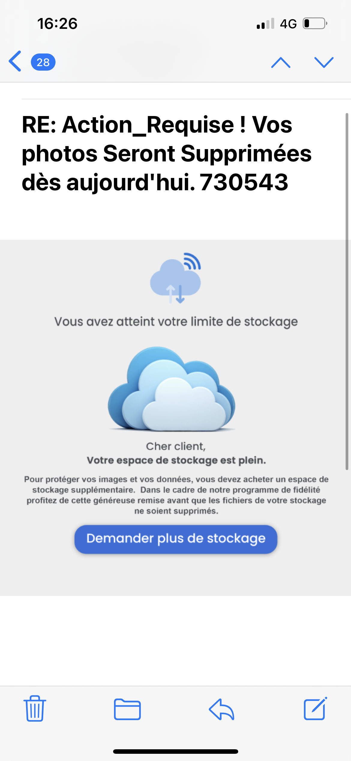 Je recois un email me disant que icloud va effacer mes photos et mes vidéos est ce que c'est correct ?