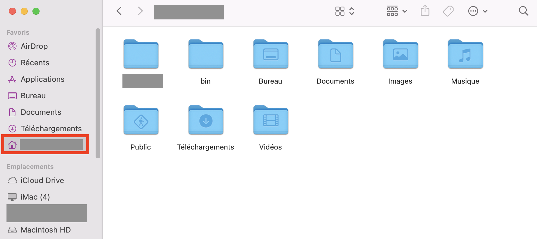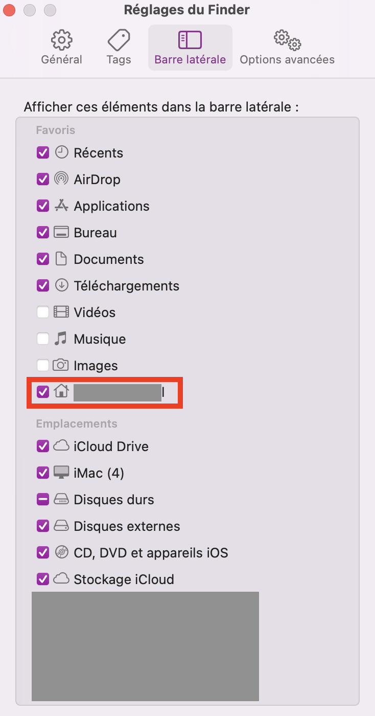Si le dossier de départ n'est pas visible dans la barre latérale du Finder, clique sur Finder dans la barre des menus, clique sur Réglages ou sur Préférences, puis clique sur Barre latérale et coche le dossier de départ.
