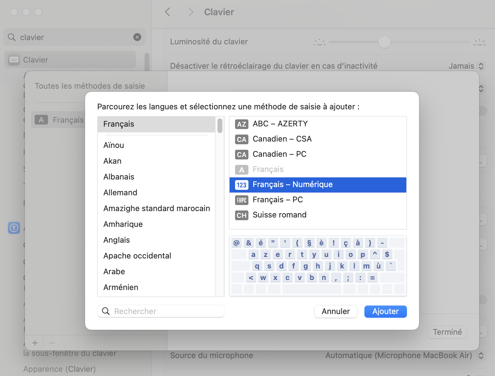 Tu rajoute un clavier dans Réglages système -> Clavier et dans les Entrée de texte -> Sources de saisie click sur le bouton "Modifier ..."