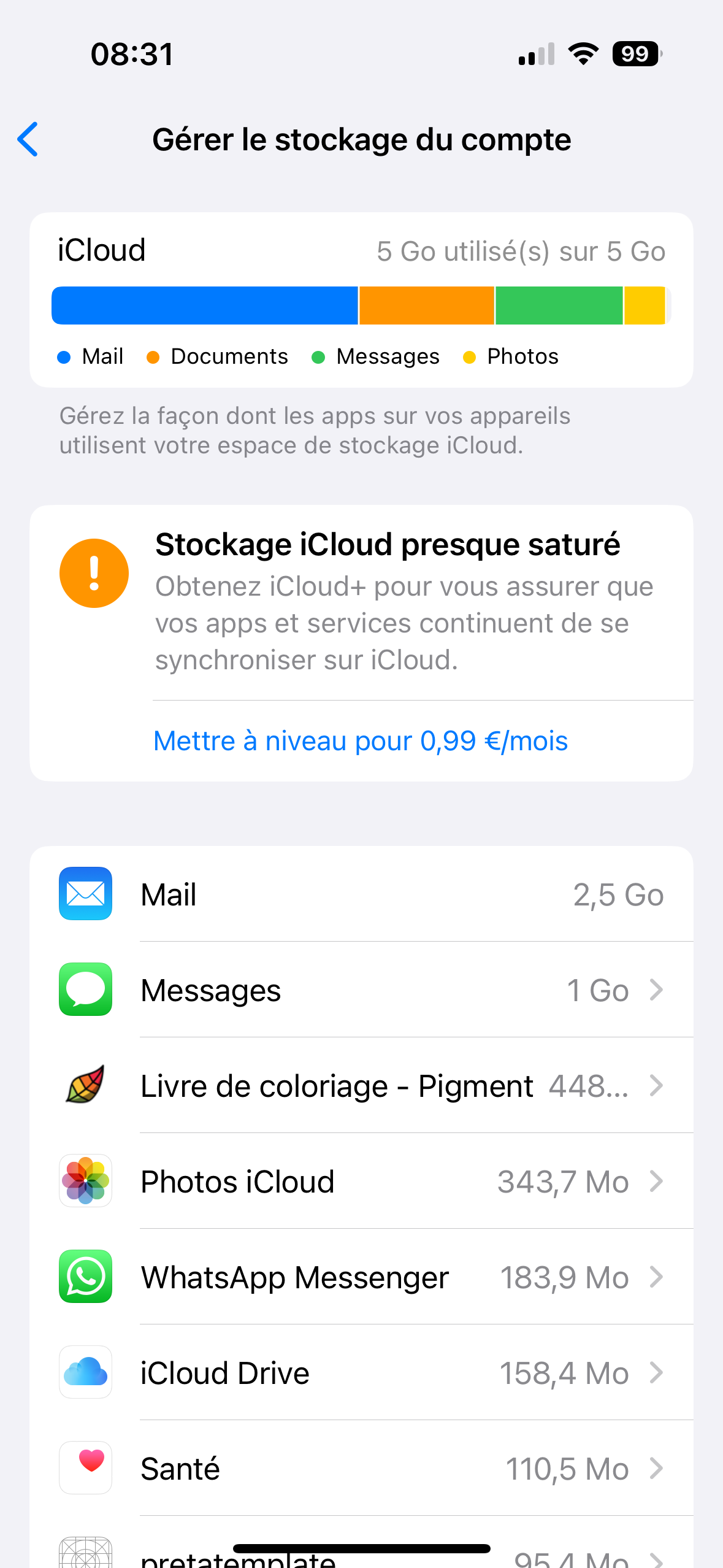 • Je crois que tu as des soucis de stockage iCloud. Combien d'espace de stockage as-tu en tout et combien te reste-t-il de libre ?