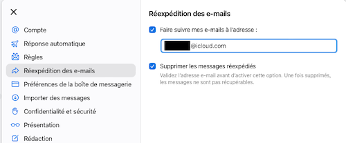 Dans ma messagerie ...... @ mé.com , j’ai coché la réexpédition de mes courriels vers l’adresse du nouveau compte .