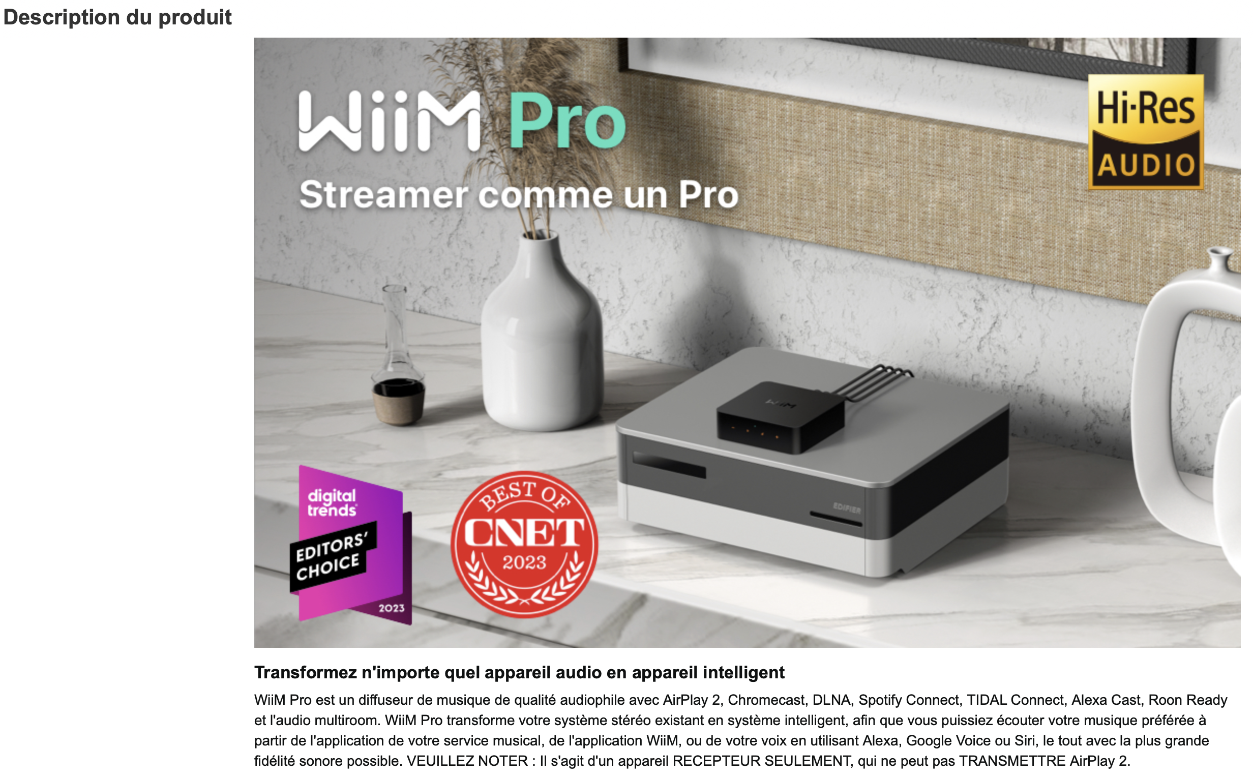 WiiM Pro Récepteur AirPlay 2, Chromecast Audio, Streamer Multi-pièces WiFi, Compatible avec Alexa, Siri et Google Assistant, Diffusion Audio Haute résolution