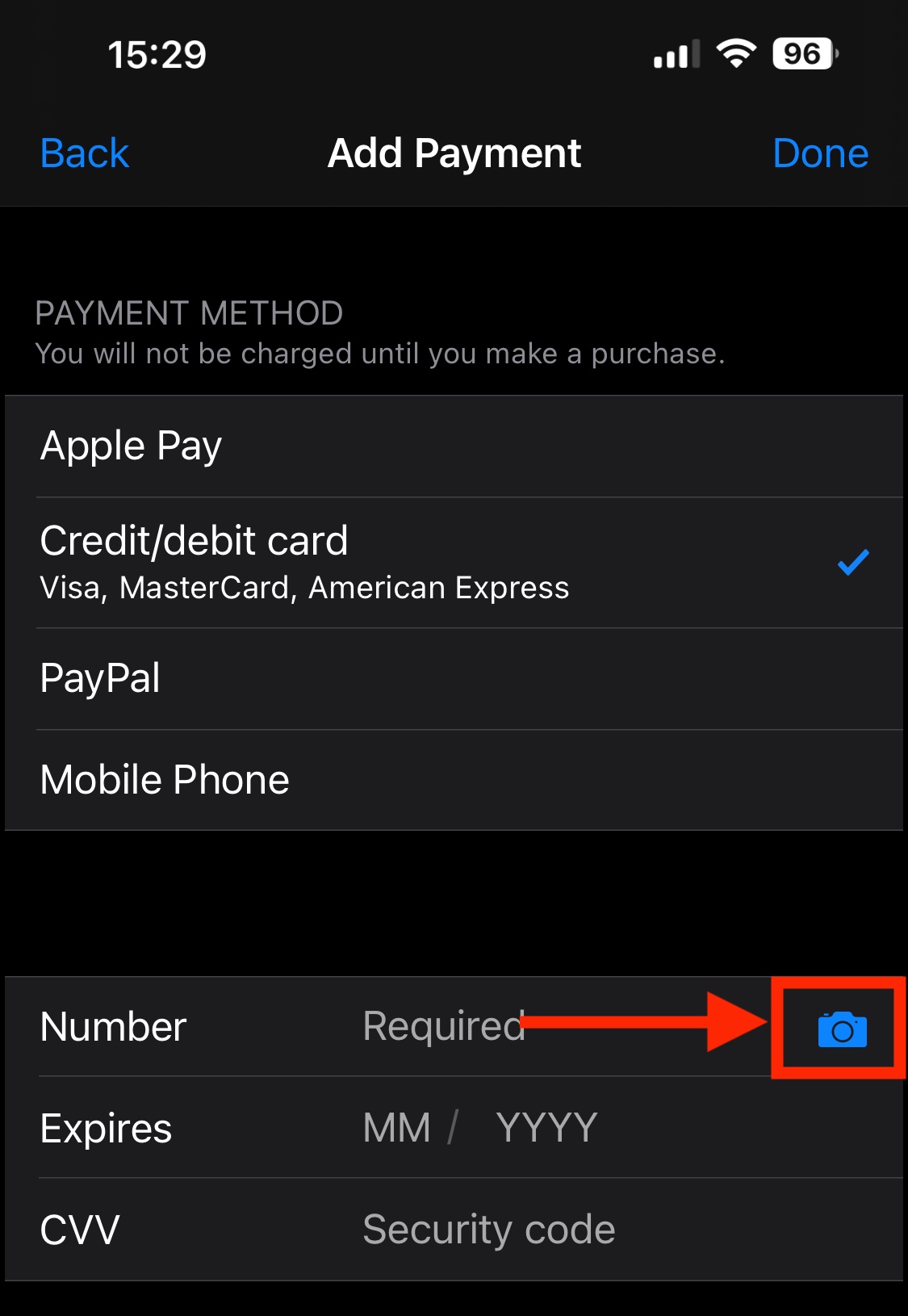 Lorsque tu vas dans Réglages > [ton nom] > Paiement et livraison, que tu cliques sur Ajouter un mode de paiement, il y a une icône d'appareil photo dans la section Numéro. Si tu cliques sur cette icône d'appareil photo, tu devrais pouvoir scanner les informations de ta carte bancaire au lieu de les saisir manuellement. Peux-tu essayer cette méthode et nous dire si cela fonctionne ?