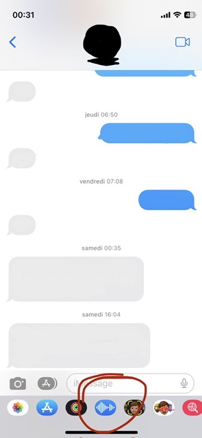 j’ai tenter d’appuyer a coté de iMessage (le petit micro)sauf que c l’auto dictée,apres,j’ai essayer audio (le truc entouré en rouge)sauf que quand j’appuie dessus rien ne s’affiche,