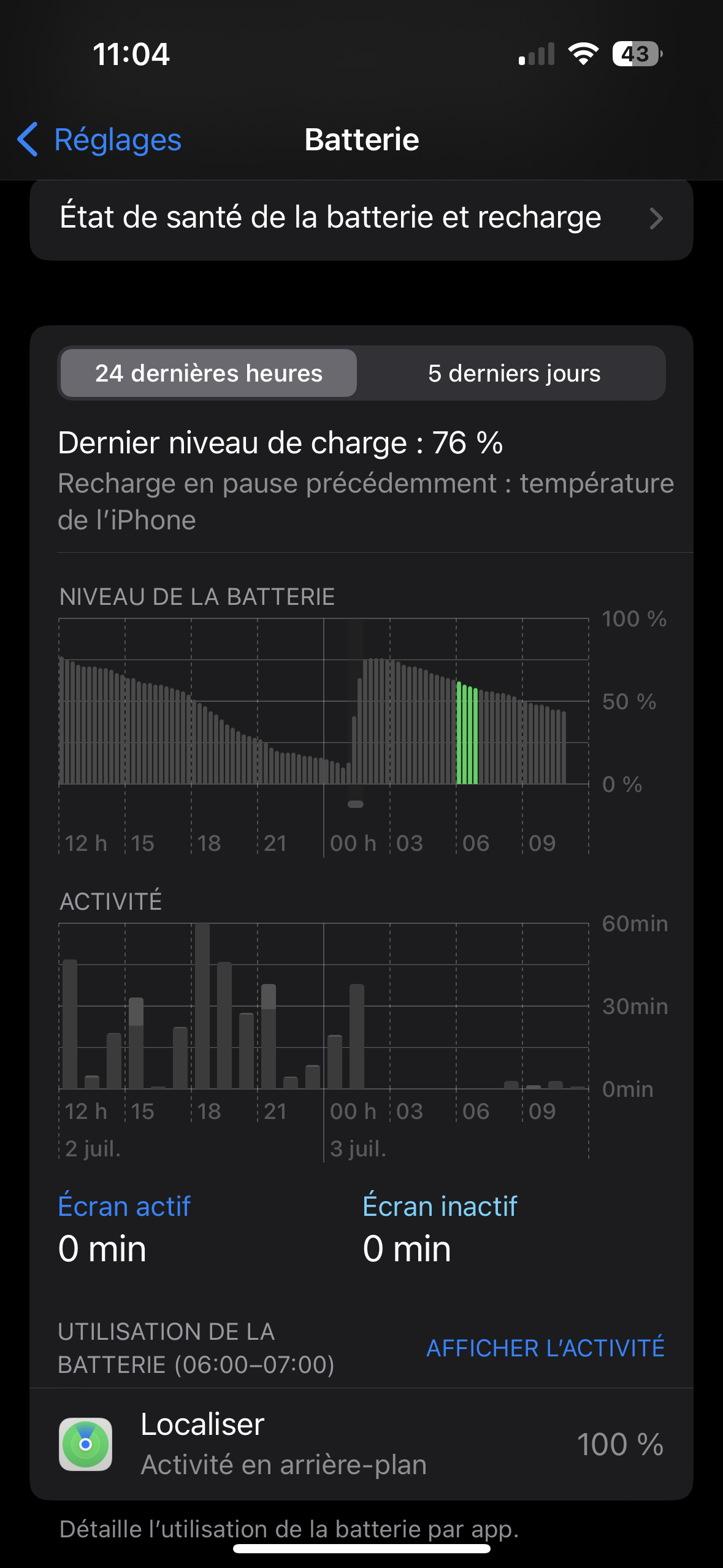 J’ai découvert dernièrement que ma batterie d’iPhone 14 pro se décharge bizarrement la nuit. Par exemple je perds 25% de batterie pendant la nuit alors que l’iPhone n’est pas utilisé et est mis en mode repos. Quand je regarde l’activité pendant ces heures où il perd la charge, il y’a l application localiser en arrière plan.