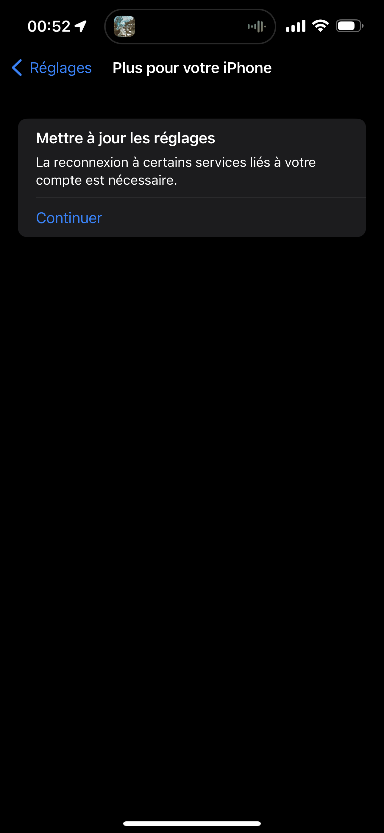 J'ai un message sur mon tel iPhone 14 Pro Max qui me dit que je dois mettre à jour les réglages pour me reconnecter à certains services.